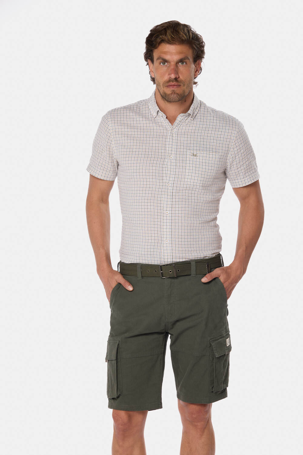 Bermuda cargo con cinto , confeccionado en tejido de algodón con elasticidad , con bolsillos laterales, detalles en bolsillos traseros con solapa .