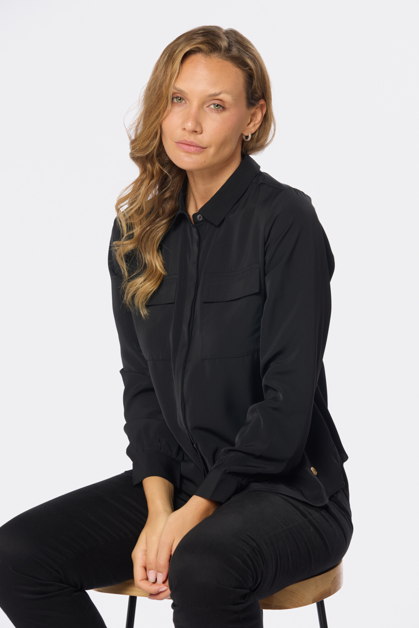 Blusa tipo camisa manga larga. Botones nacarados ocultos con cartera. Tela suave y sedosa con doble capa en el frente para evitar transparencias. Modelo usa talle S y mide 1,74.