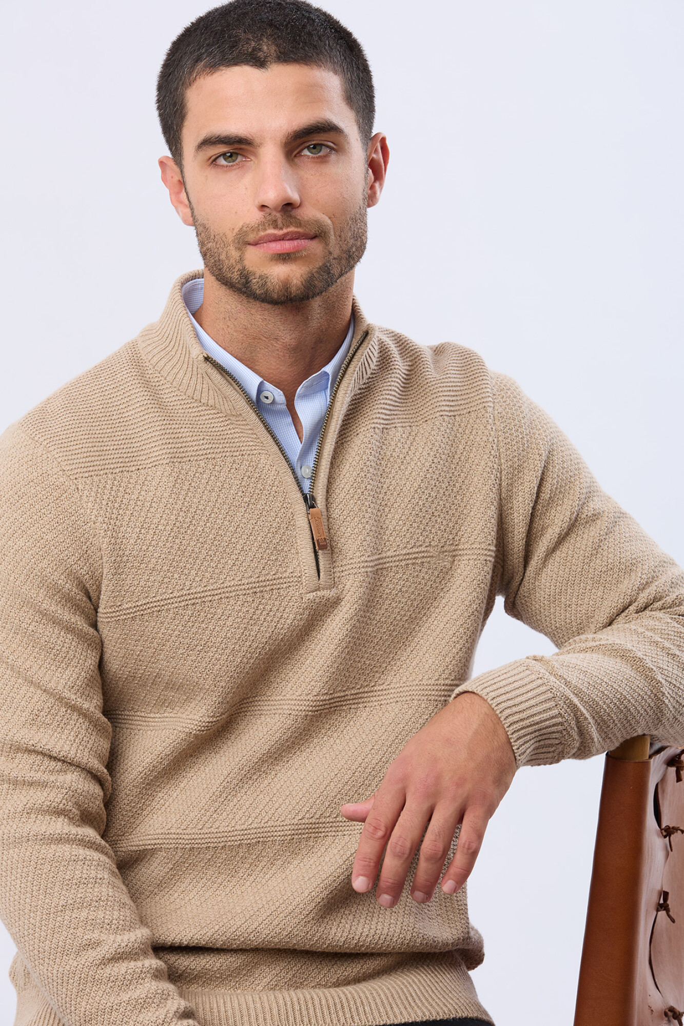 Buzo 1/2 cierre tejido con estructura. Cierre con detalle en cuero y logo bordado. Tu compañero ideal en la temporada fría. Perfecto para vestirte en capas cuando el frío aprieta o para usar como pieza principal en días de temperatura media.