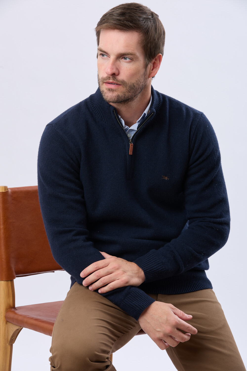 Buzo tejido de LANA medio cierre metálico con cuello alto. Logo bordado en el pecho.