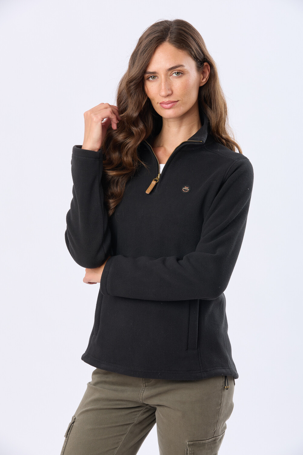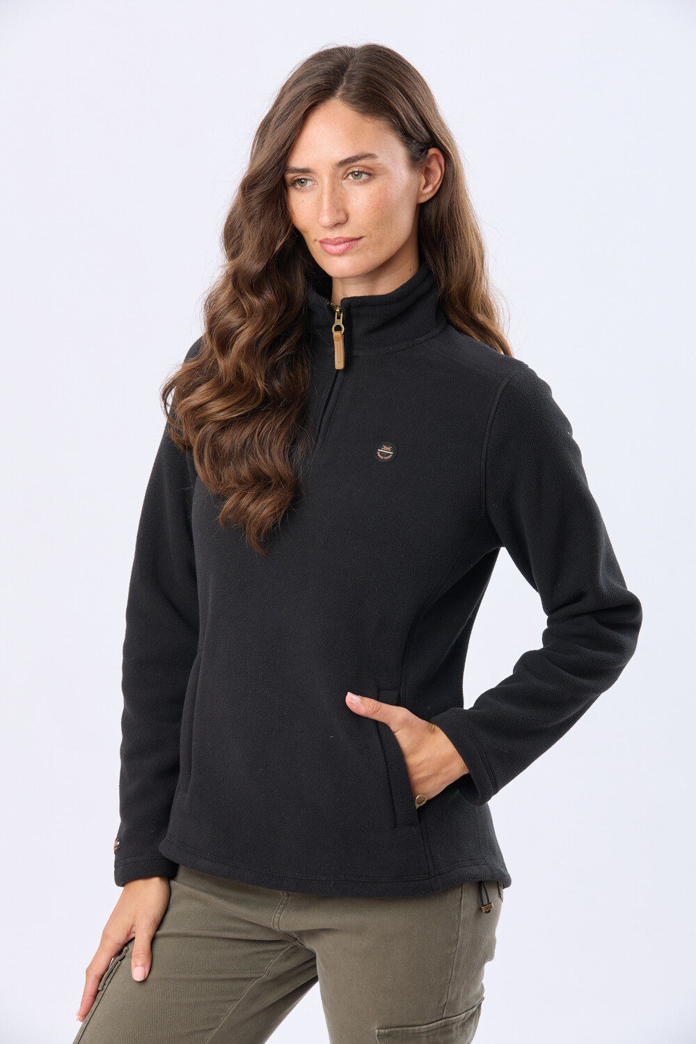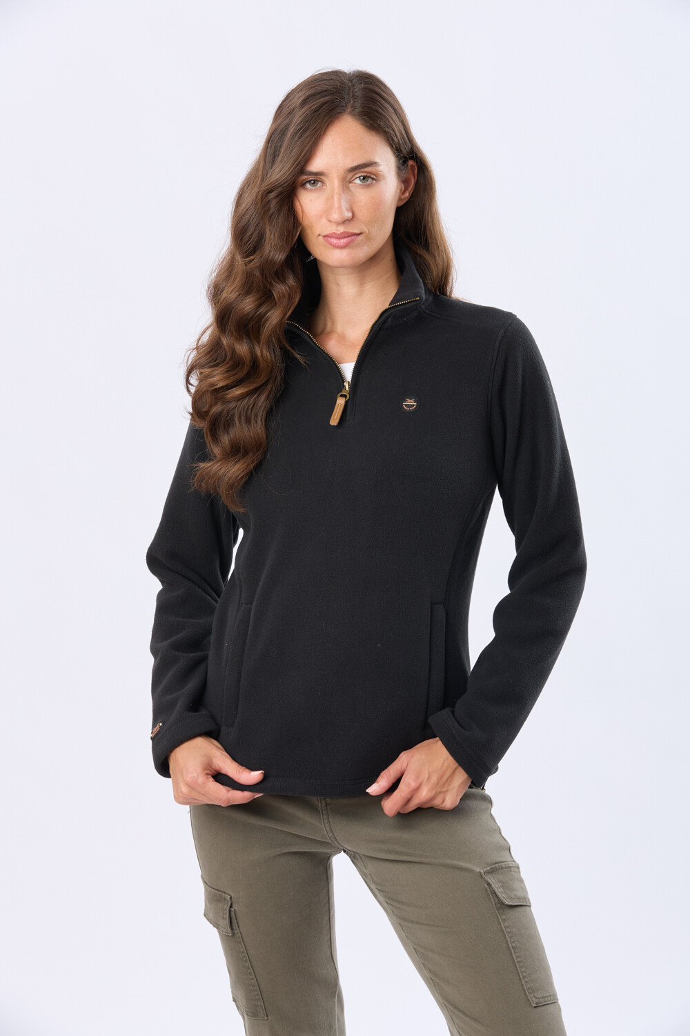Buzo polar de abrigo con medio cierre para el día a día. Con bolsillos laterales y detalles en cuero. Confort y funcionalidad para quien busca calidez en los días fríos. La modelo mide 1.70m y usa talle S