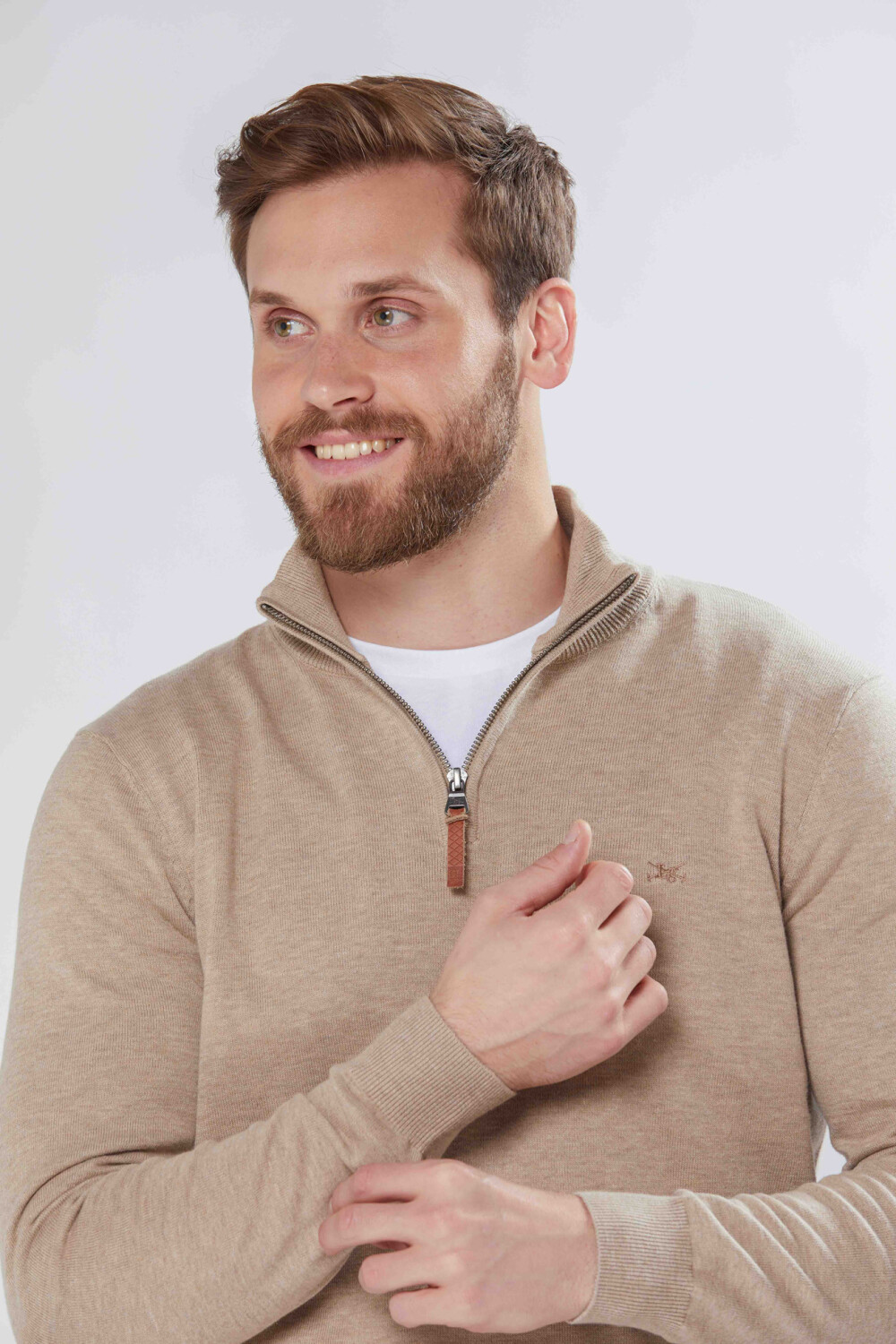 Buzo liso tejido fino en hilo de algodón. Cuello con cierre con detalle en cuero. El modelo mide 1,82 m y usa talle M.
