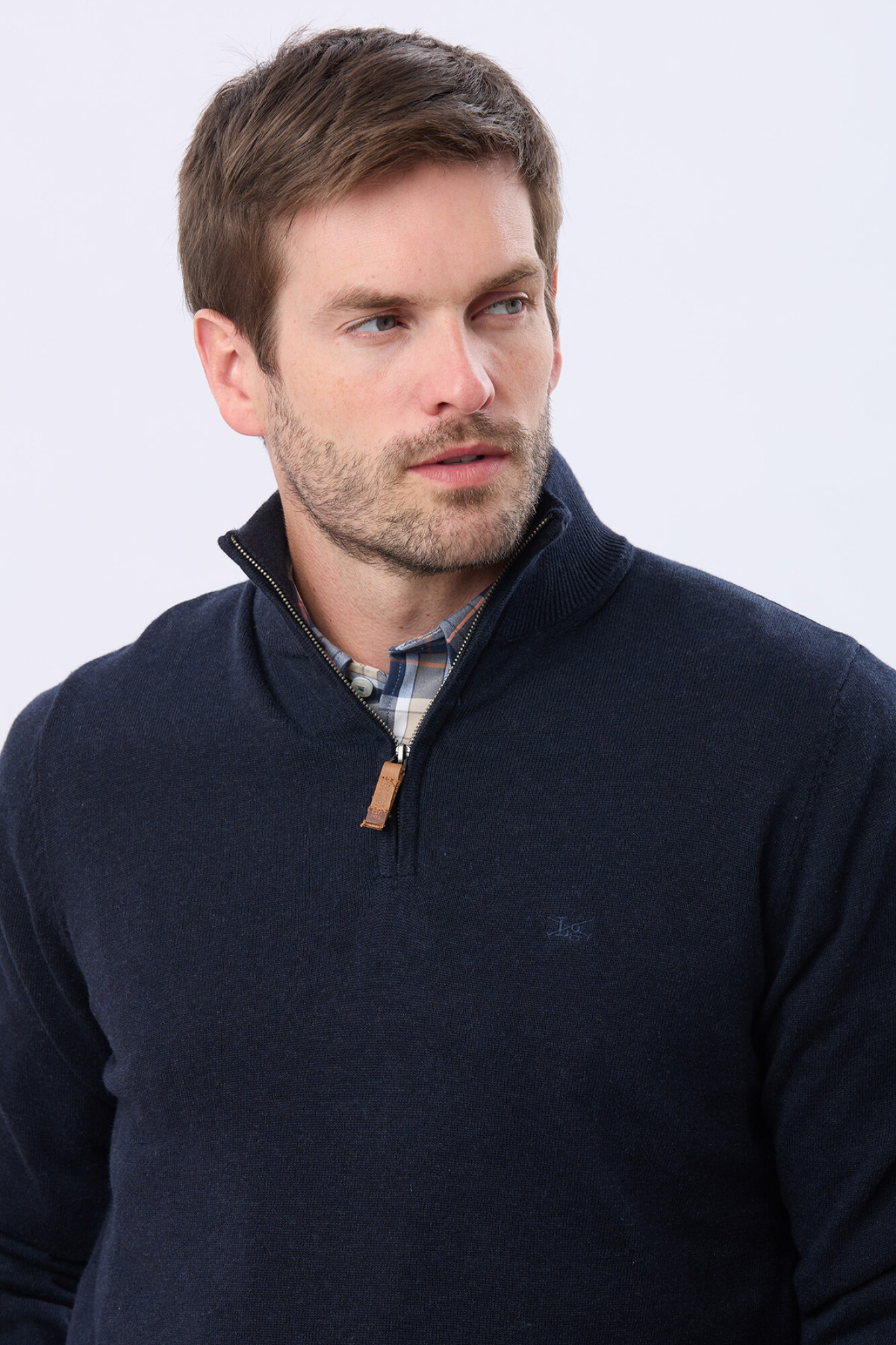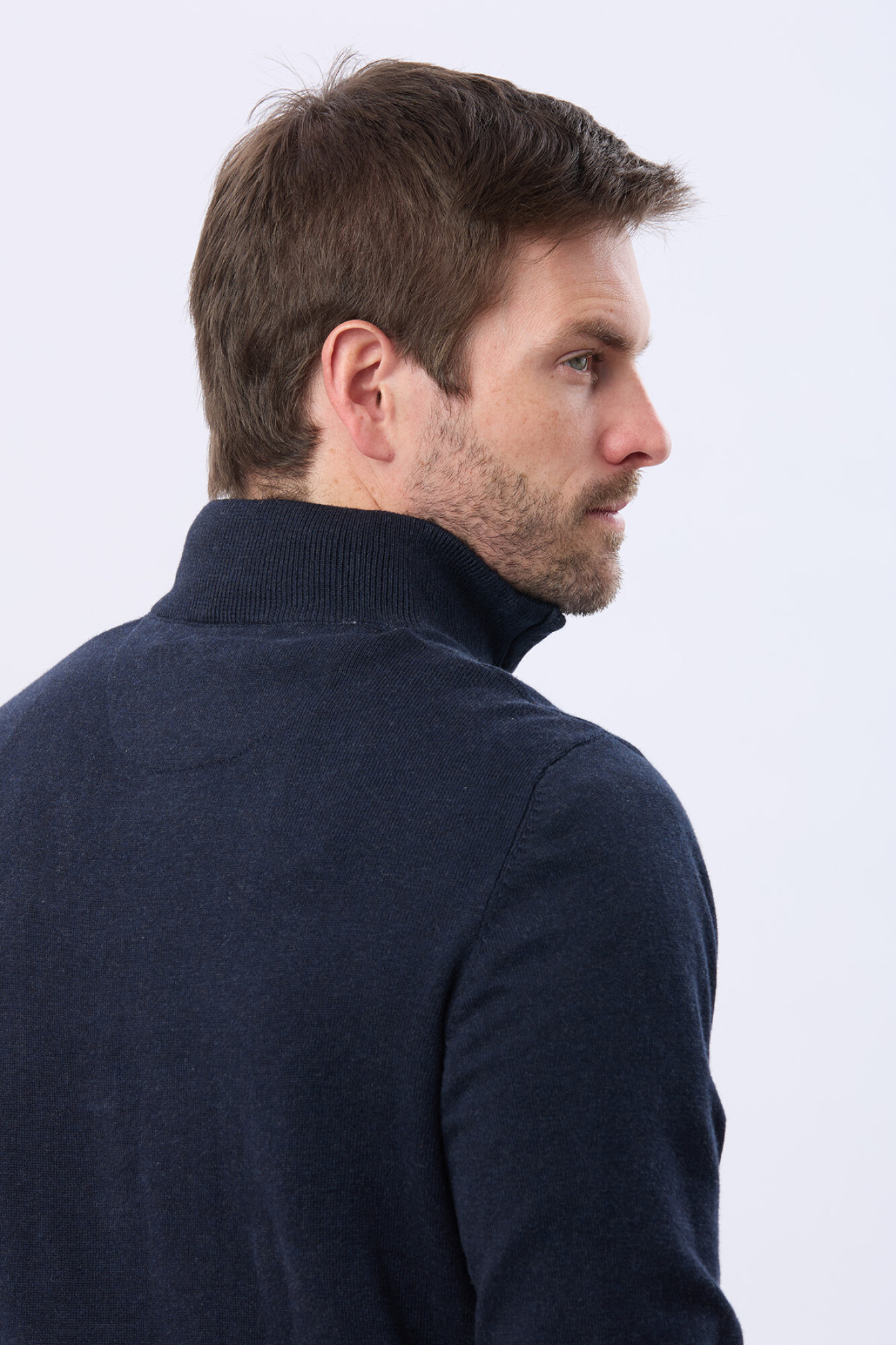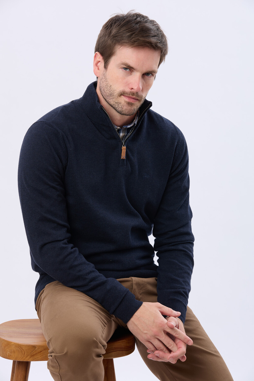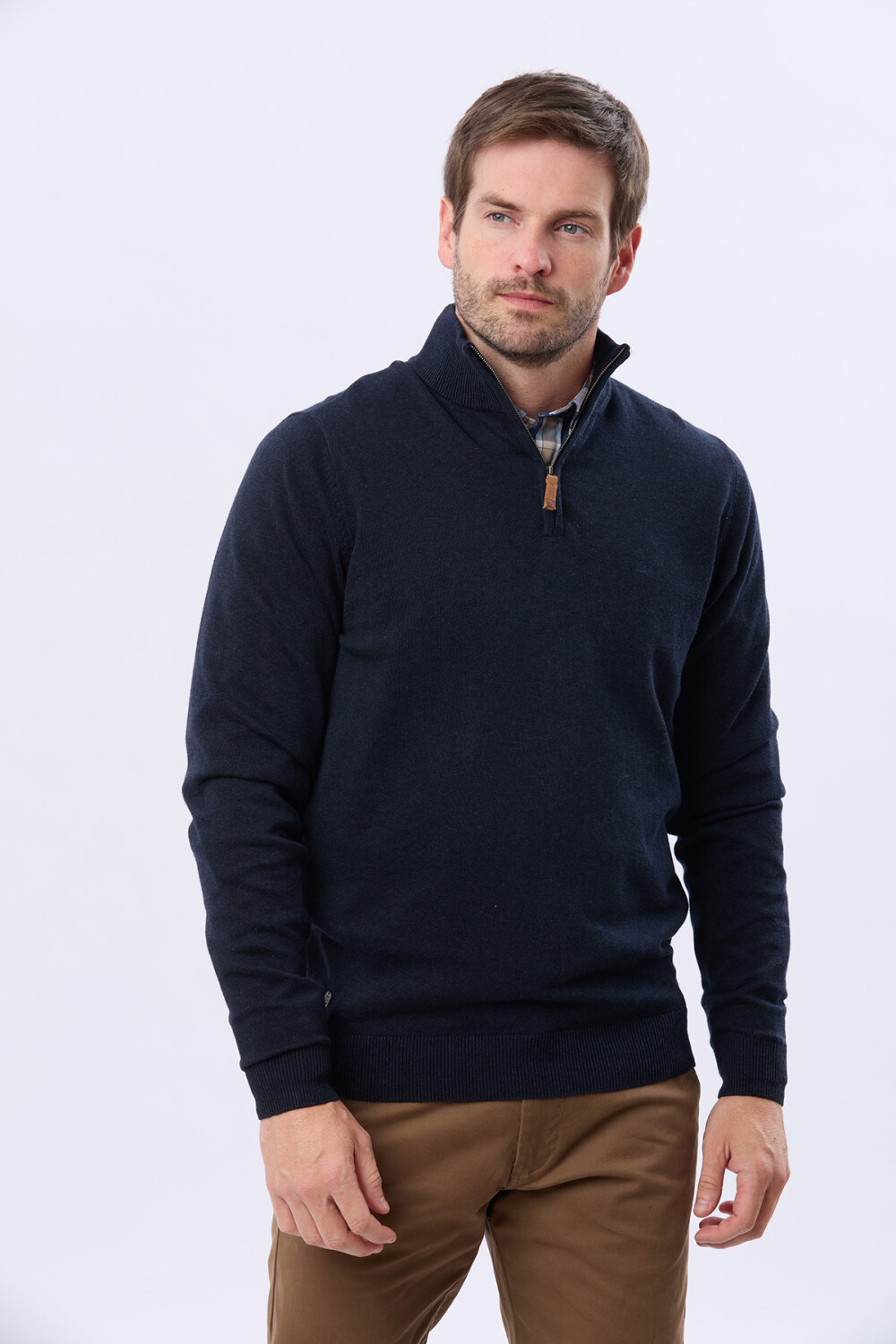 Buzo tejido liso de algodón. Cuello con cierre con detalle en cuero. Para quienes buscan el abrigo verdadero del invierno con un estilo masculino bien definido. El modelo mide 1,85 m y usa talle M.