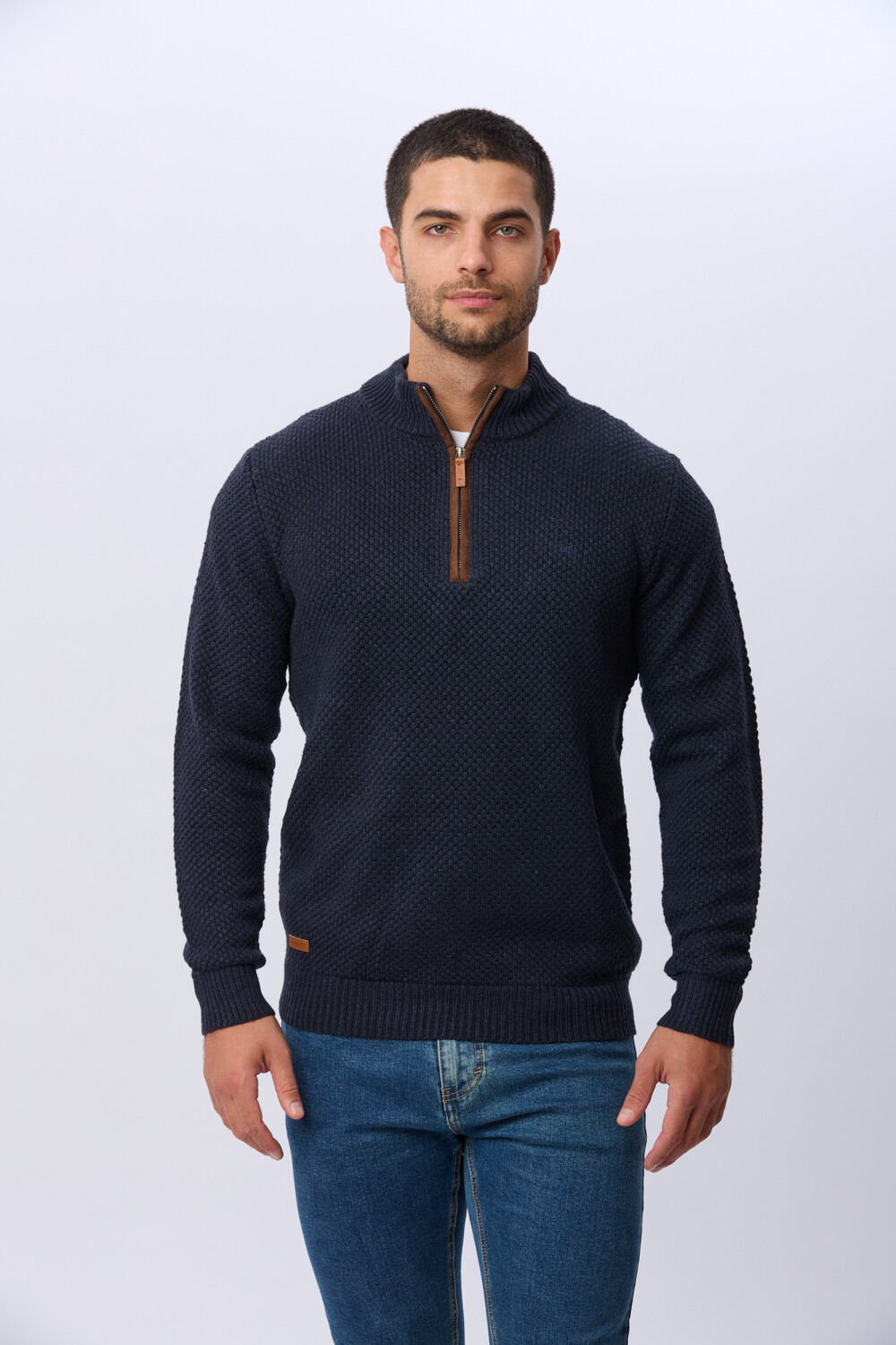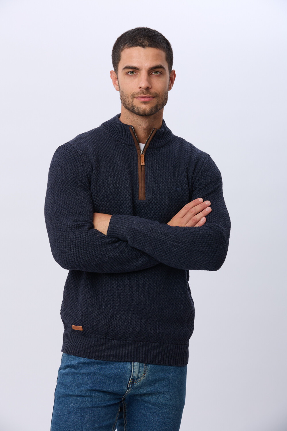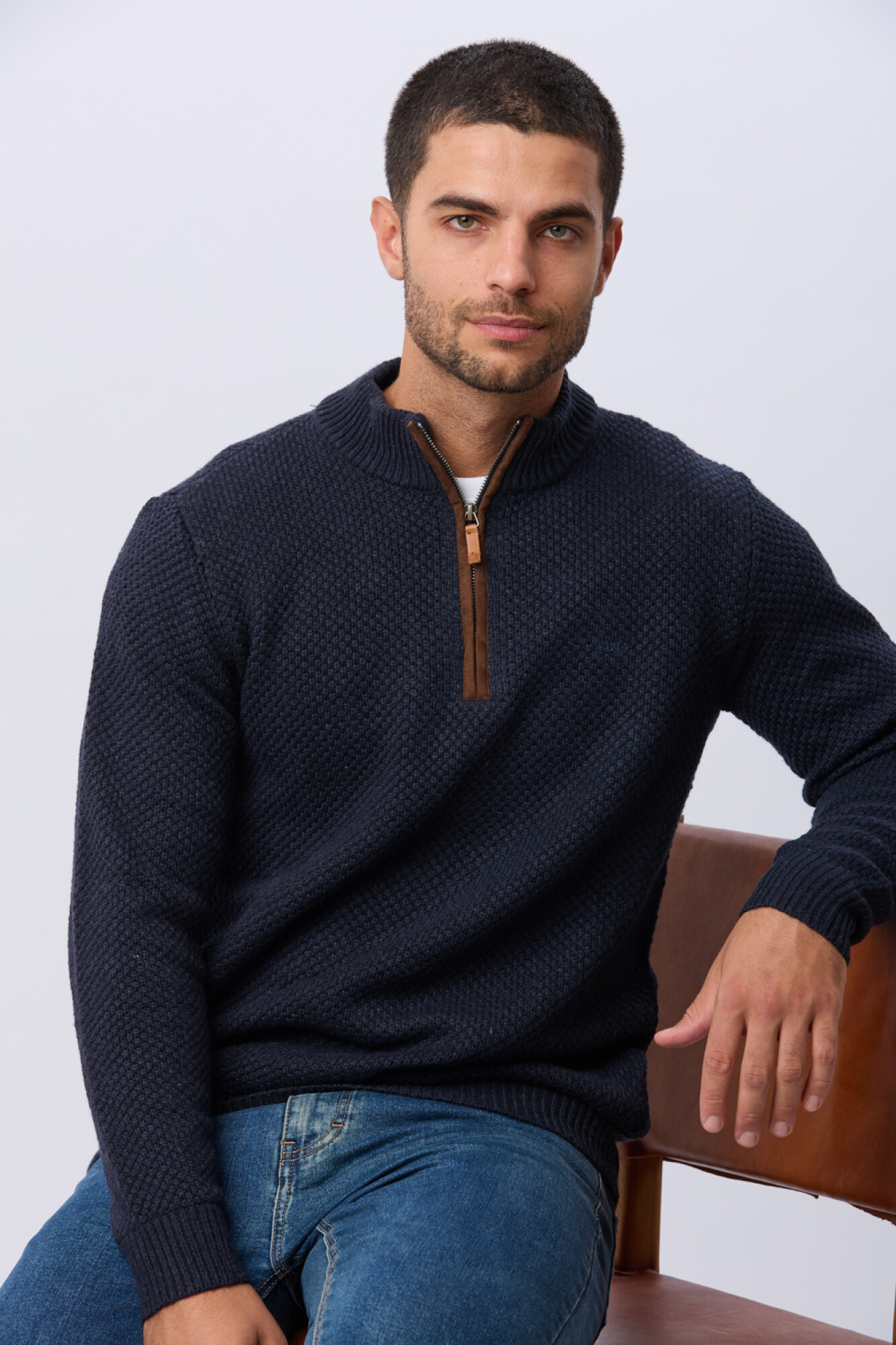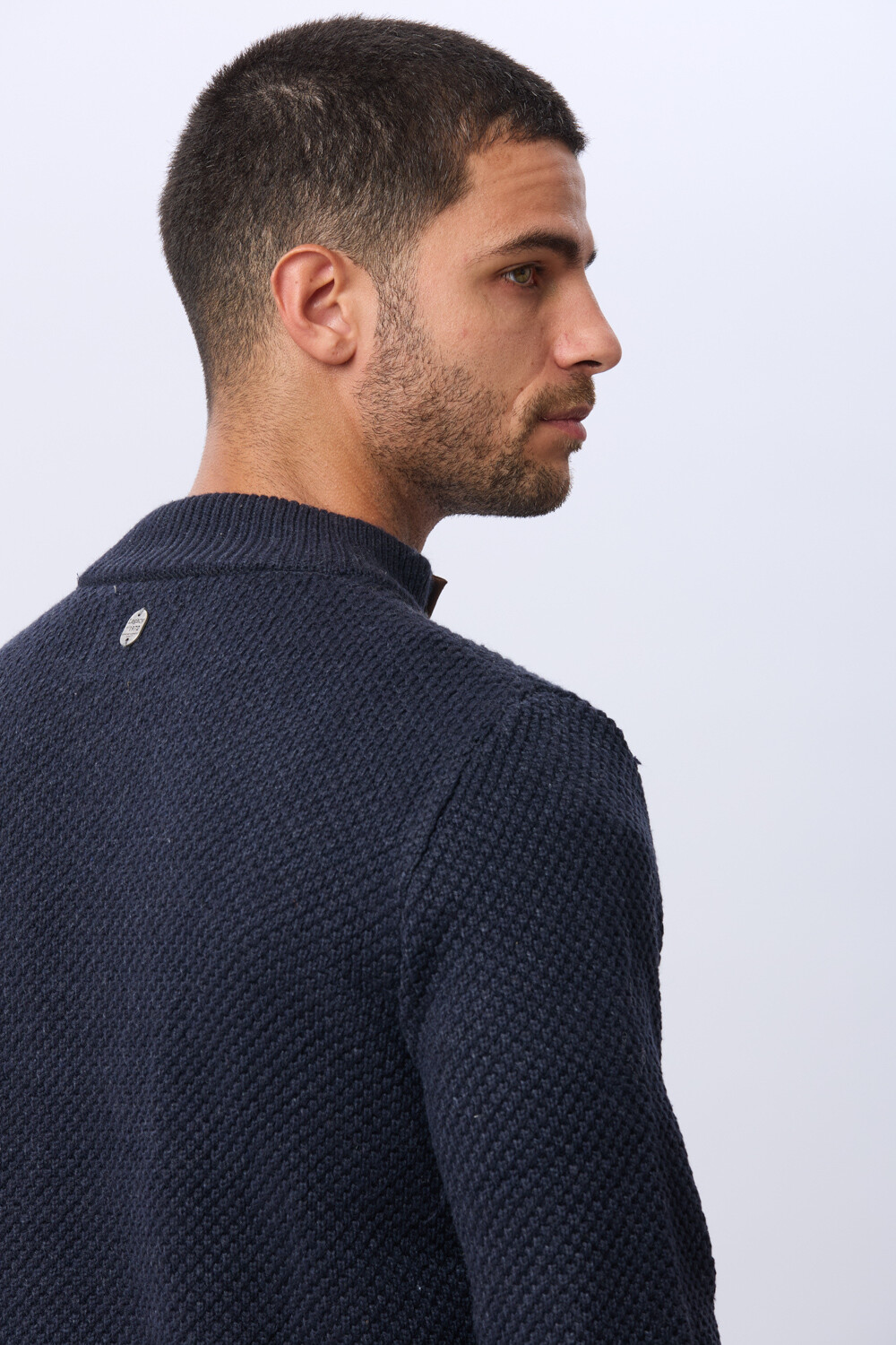 Buzo tejido de abrigo en hilo grueso. Cuello con cierre con detalle en gamuza. La textura en relieve le aporta carácter al guardarropa invernal. El modelo mide 1,85 m y usa talle M.