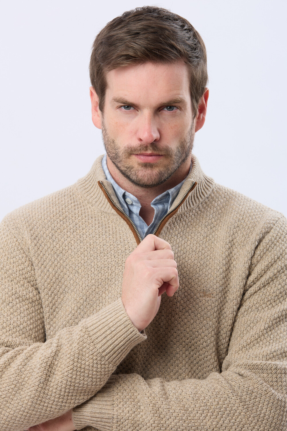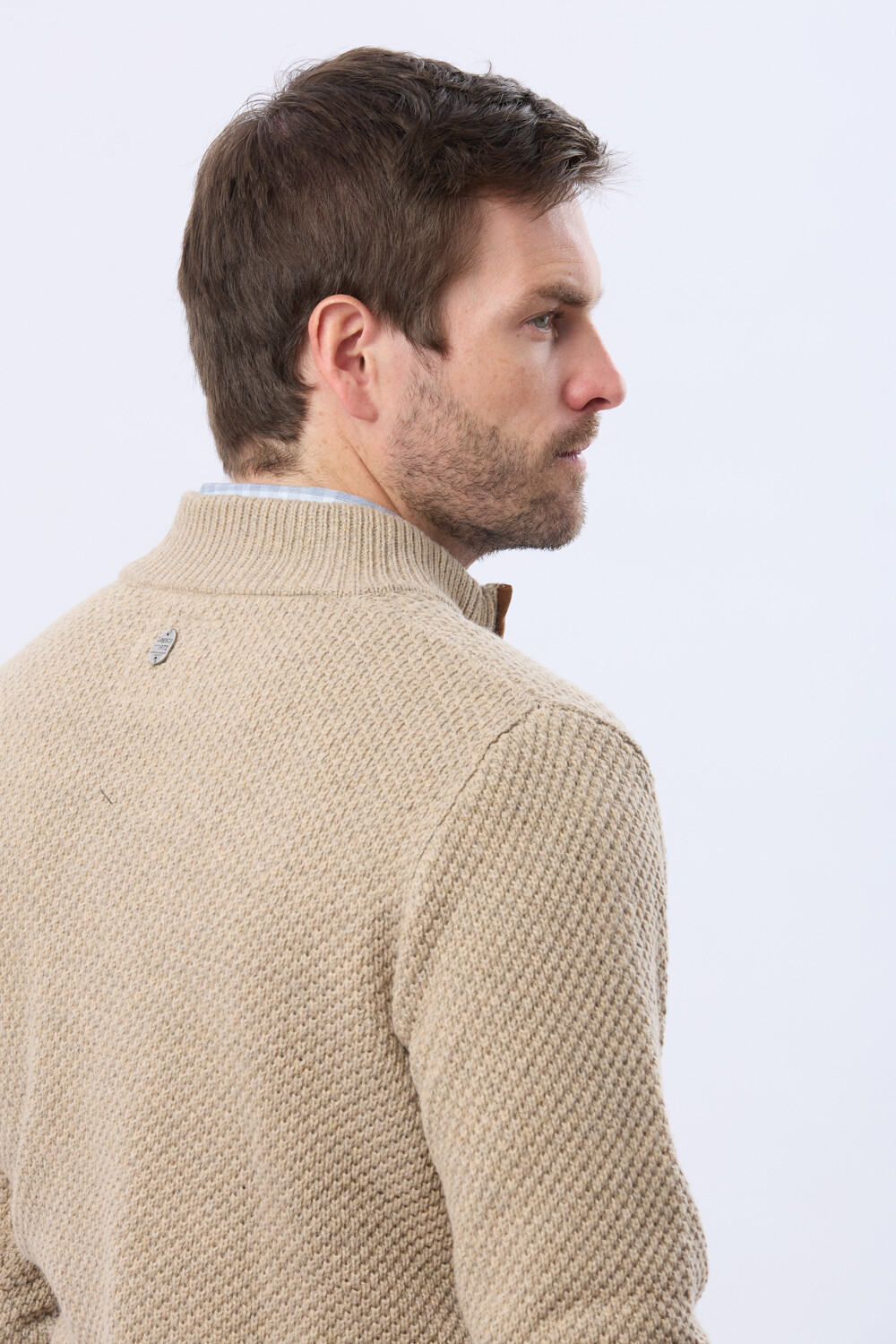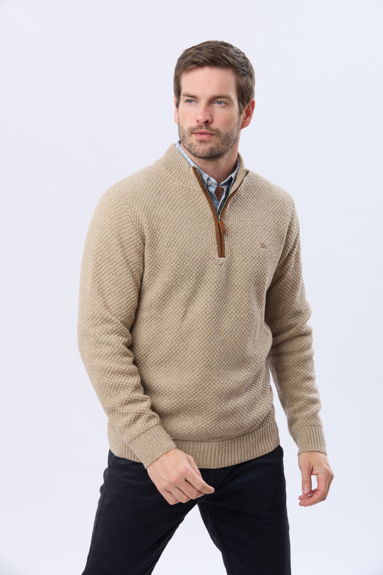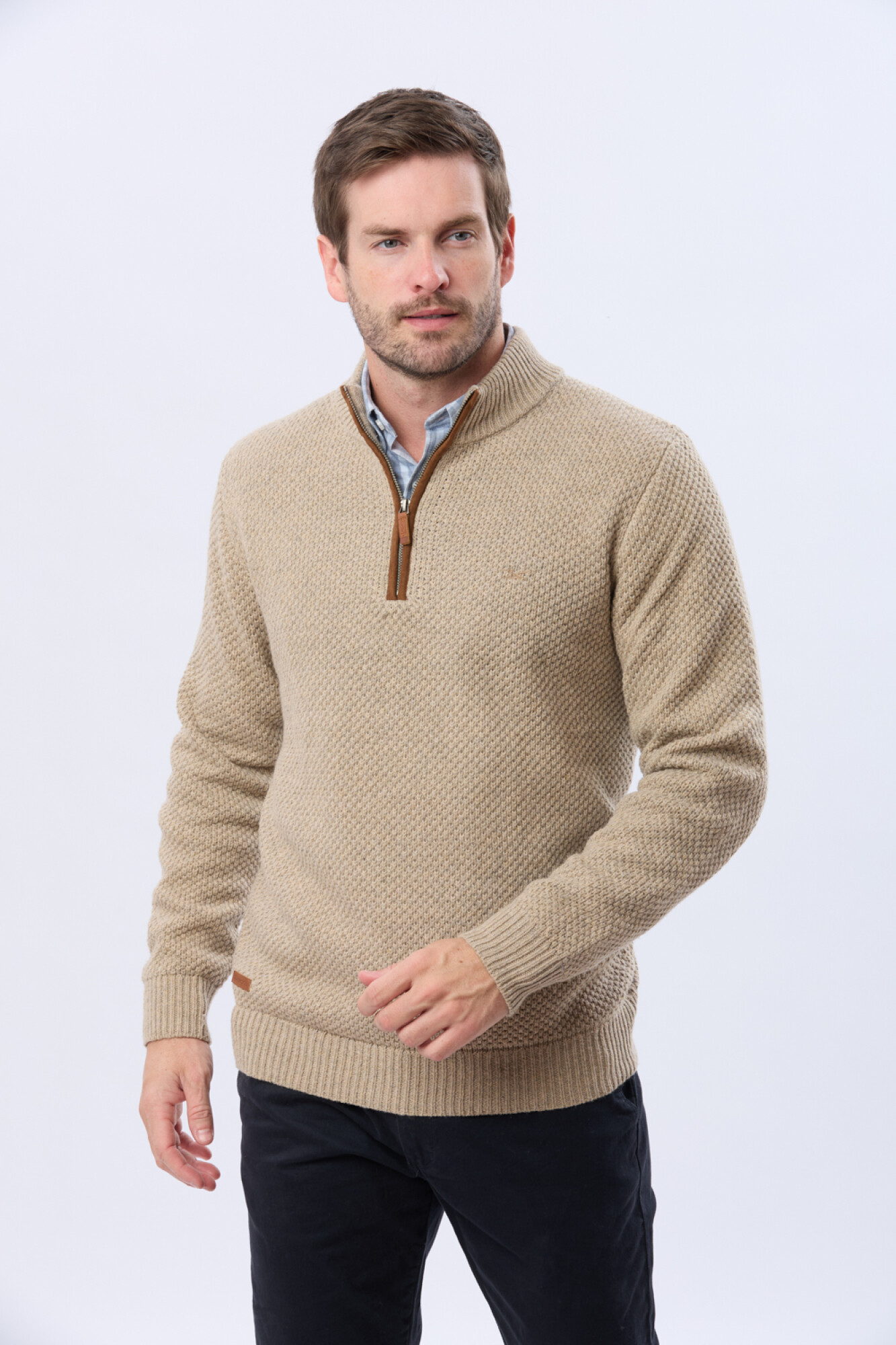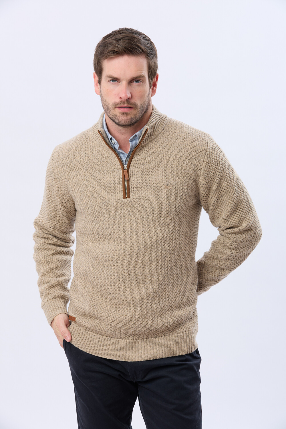 Buzo tejido de abrigo en hilo grueso. Cuello con cierre con detalle en gamuza. La textura en relieve le aporta carácter al guardarropa invernal. El modelo mide 1,85 m y usa talle M.