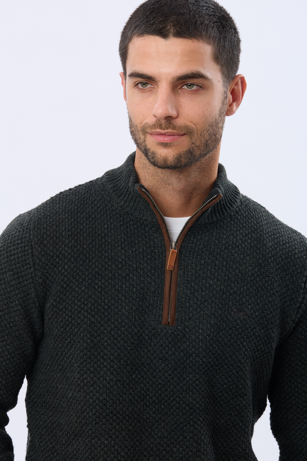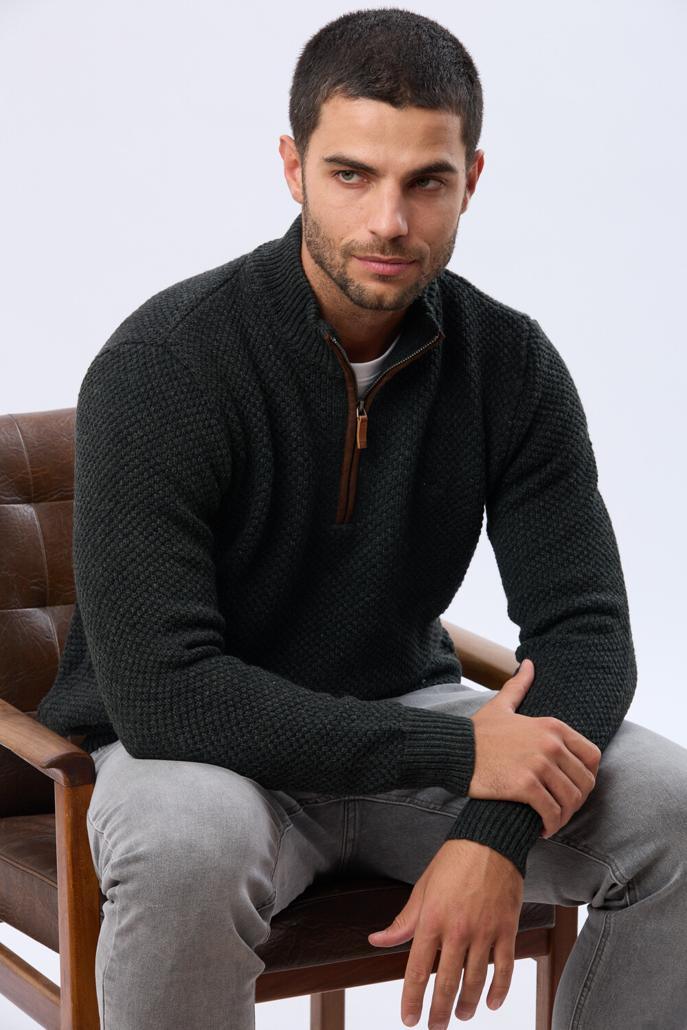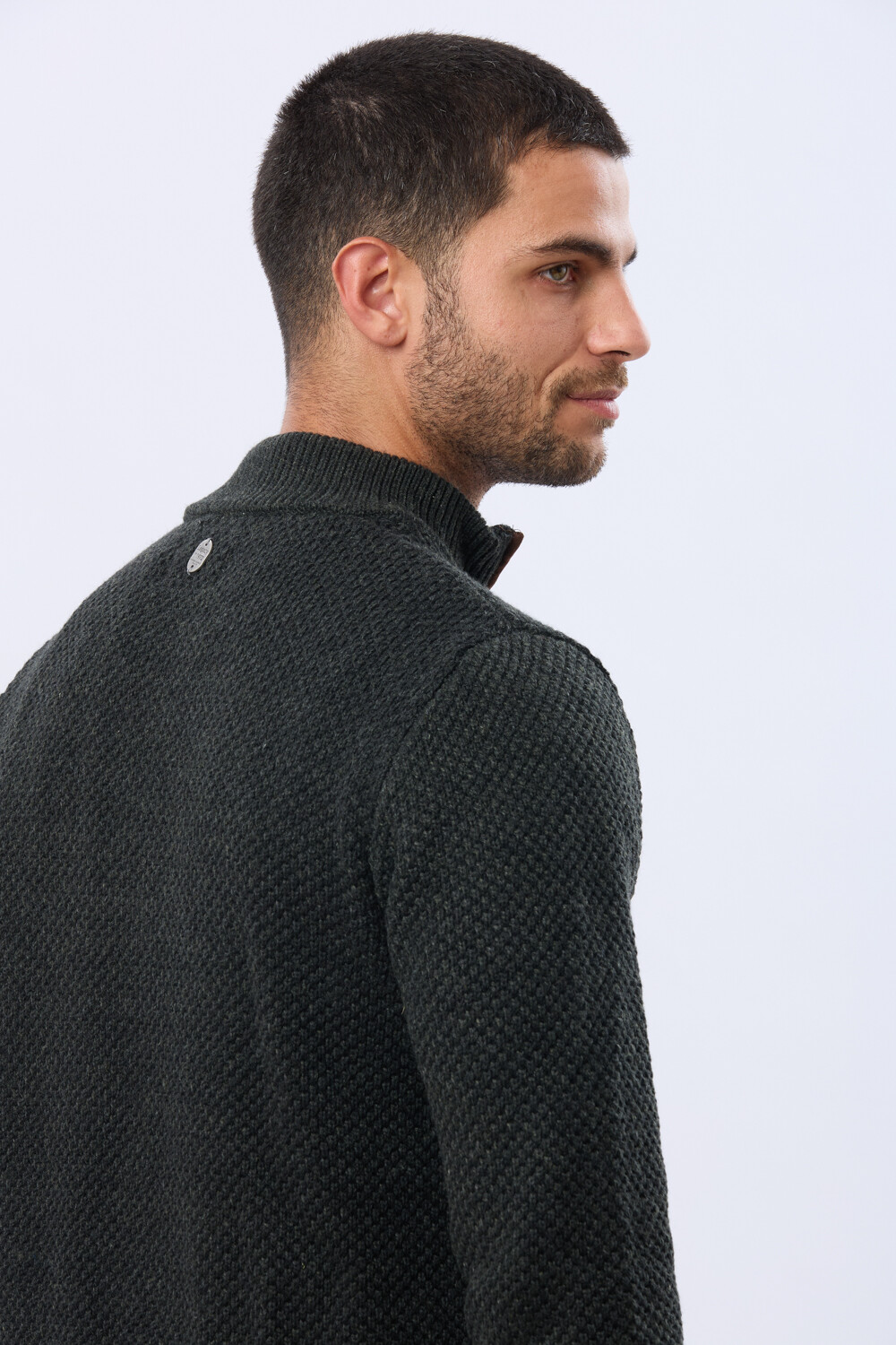 Buzo tejido de abrigo en hilo grueso. Cuello con cierre con detalle en gamuza. La textura en relieve le aporta carácter al guardarropa invernal. El modelo mide 1,85 m y usa talle M.