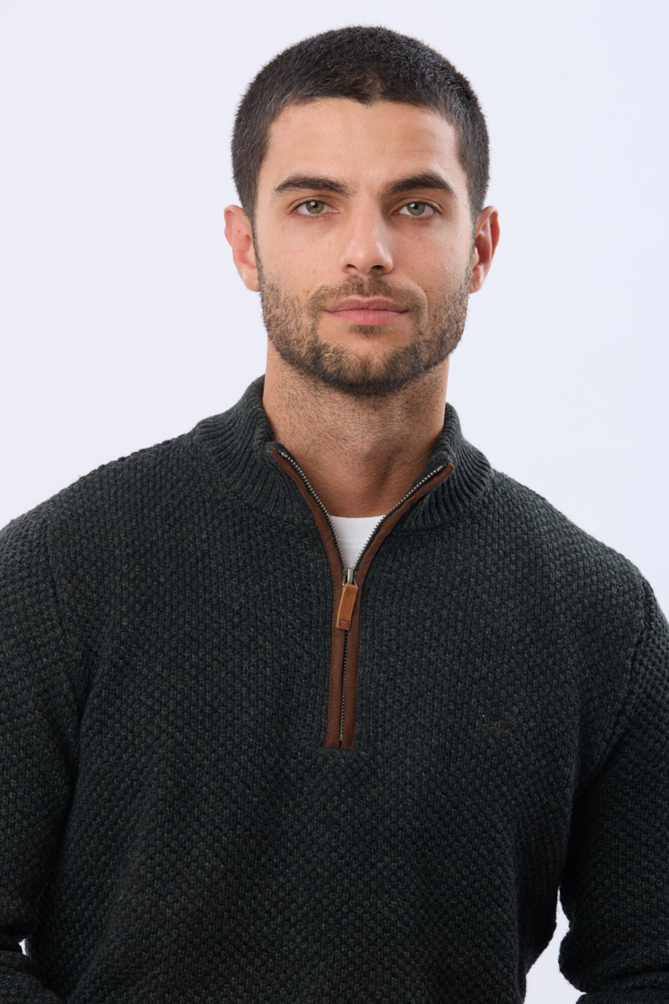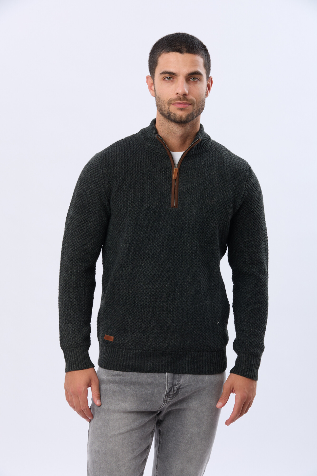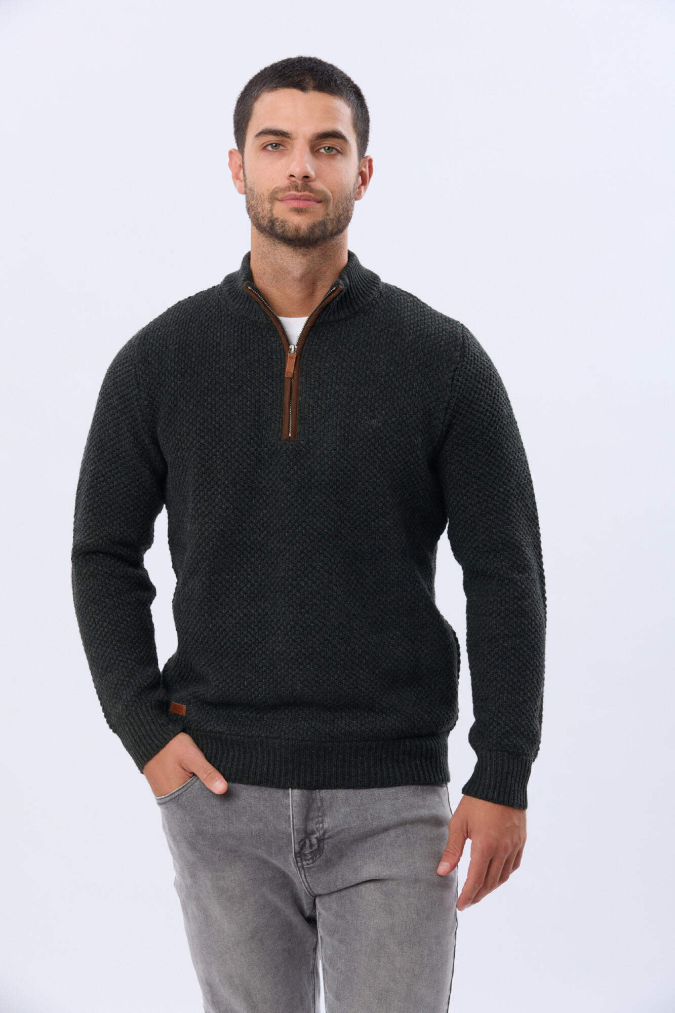 Buzo tejido de abrigo en hilo grueso. Cuello con cierre con detalle en gamuza. La textura en relieve le aporta carácter al guardarropa invernal. El modelo mide 1,85 m y usa talle M.