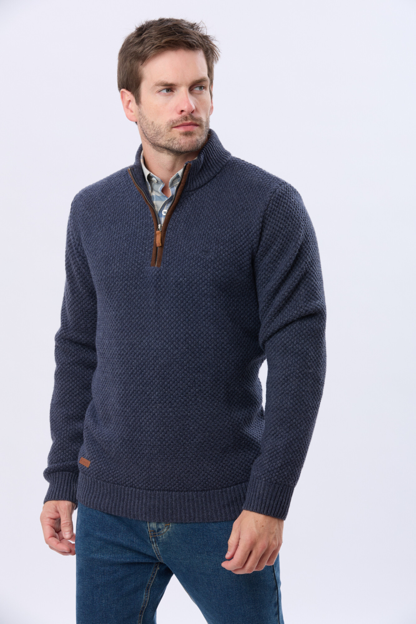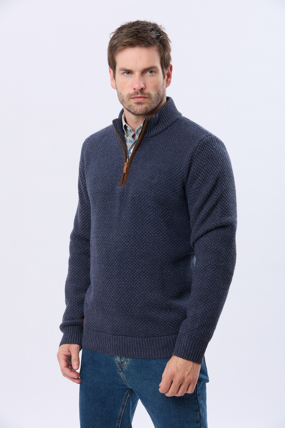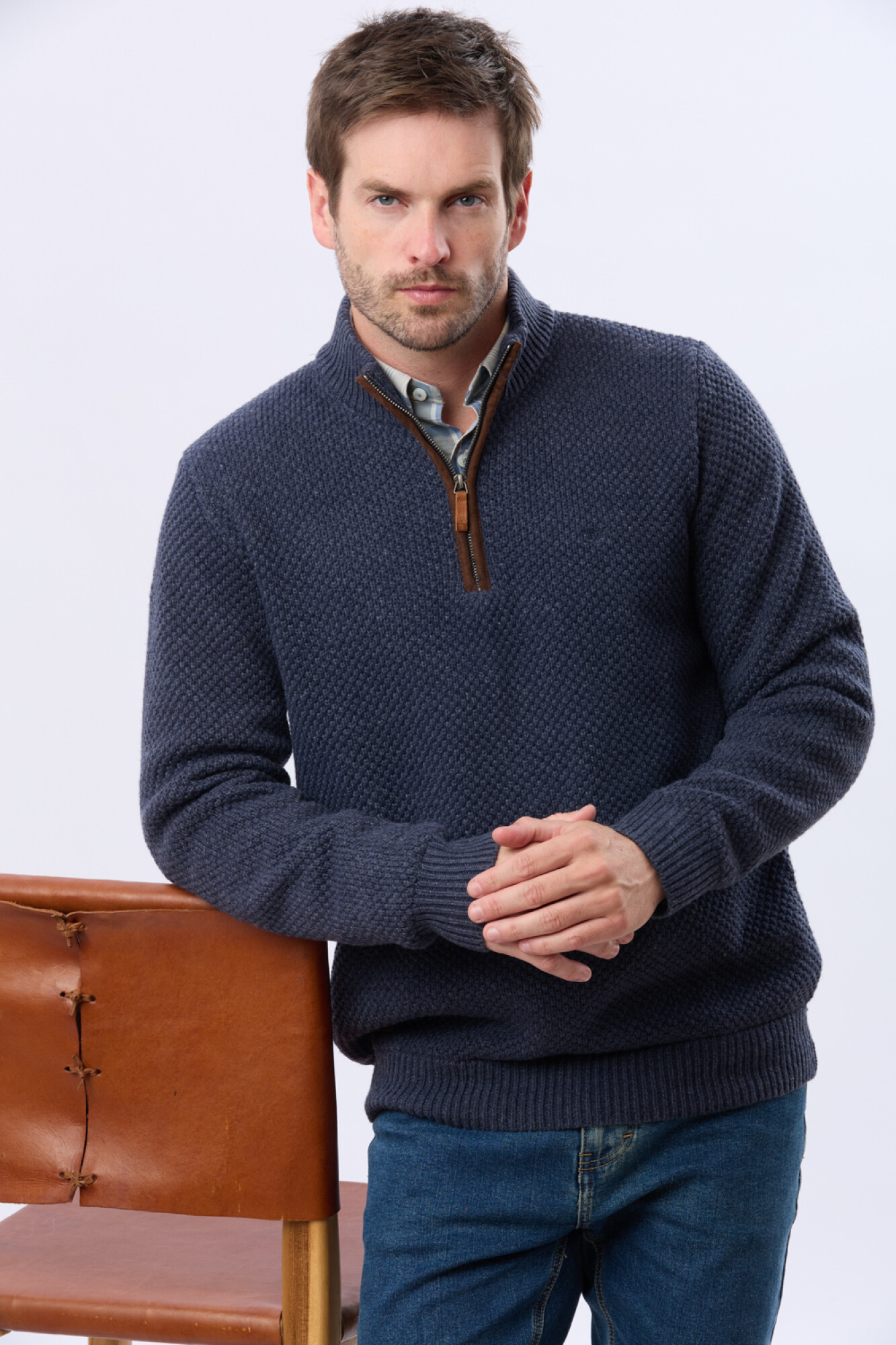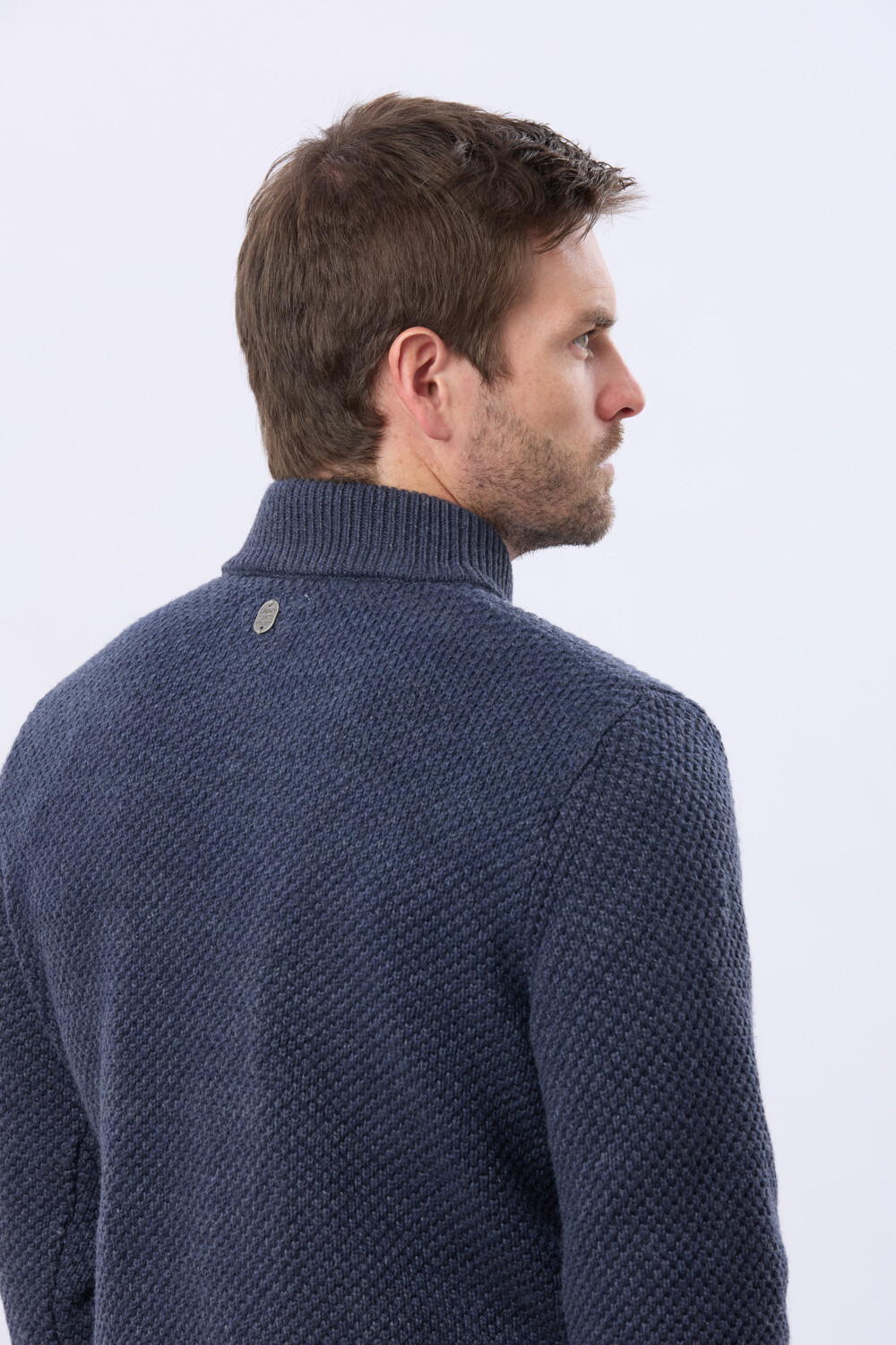 Buzo tejido de abrigo en hilo grueso. Cuello con cierre con detalle en gamuza. La textura en relieve le aporta carácter al guardarropa invernal. El modelo mide 1,85 m y usa talle M.