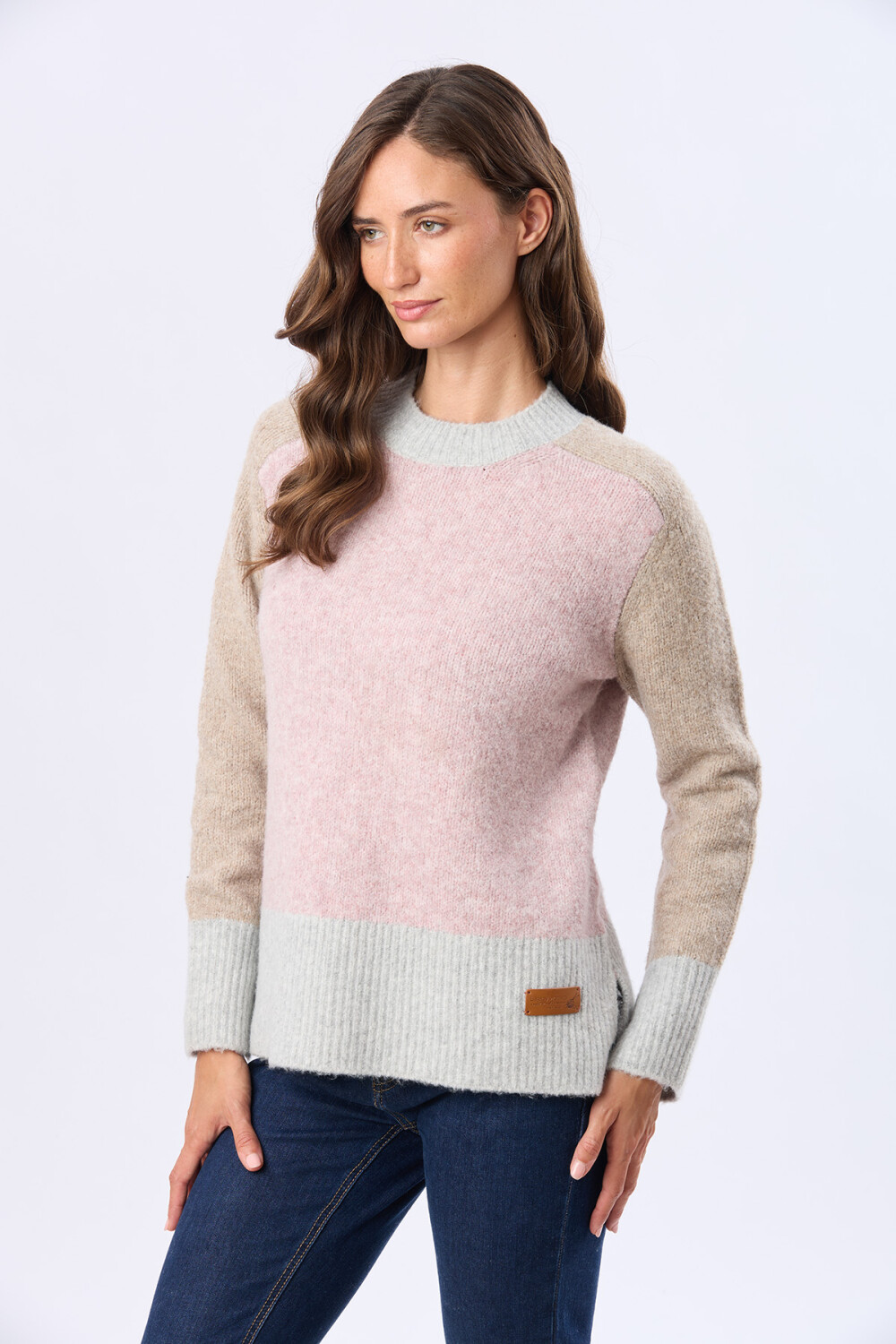 Buzo tejido liso de abrigo. La combinación de bloques de color crea una pieza con identidad propia para el invierno con estilo. frescos. La modelo mide 1,70 m y usa talle S.