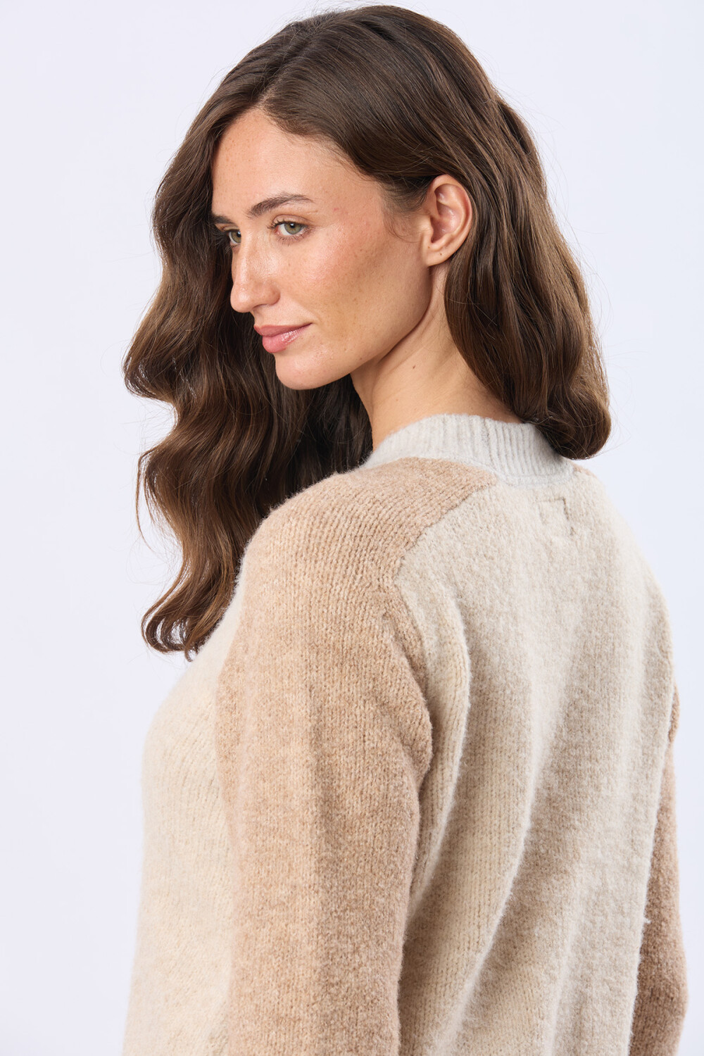 Buzo tejido liso de abrigo. La combinación de bloques de color crea una pieza con identidad propia para el invierno con estilo. frescos. La modelo mide 1,70 m y usa talle S.