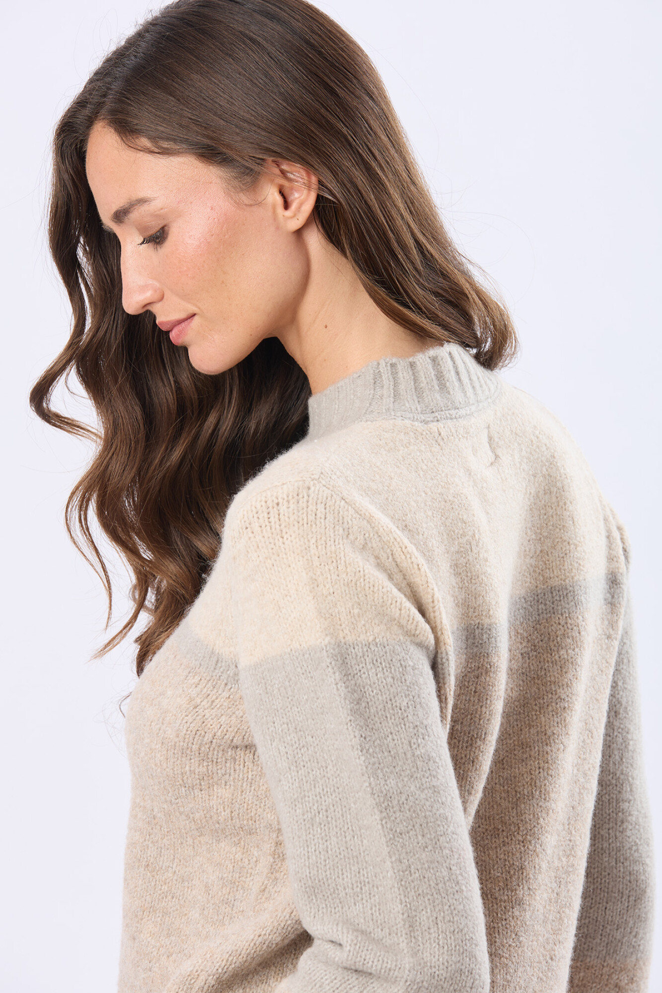 Buzo tejido con diseño de bloques de color. Posee un cuello alto abrigado, y corte holgado que garantiza máximo confort y estilo. La modelo mide 1,70 m y usa talle S.