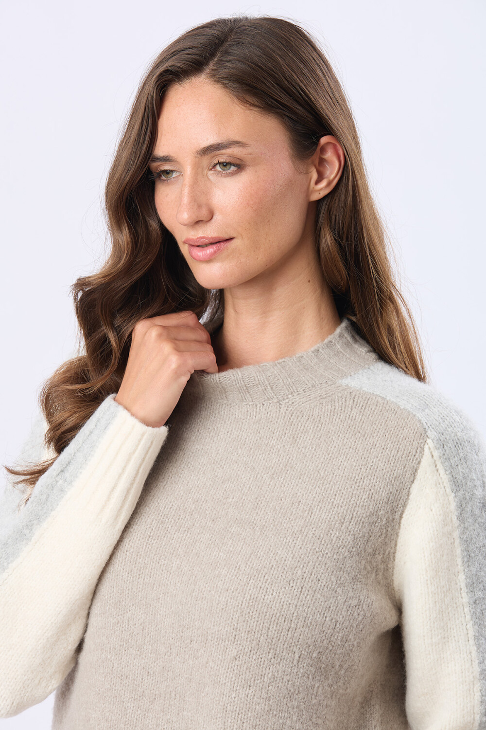 Buzo tejido de abrigo. Franja en largo de la manga a tono. La combinación de colores genera una pieza con mucha presencia visual. Detalle de logo en cuero en la parte inferior. La modelo mide 1,70 m y usa talle S.
