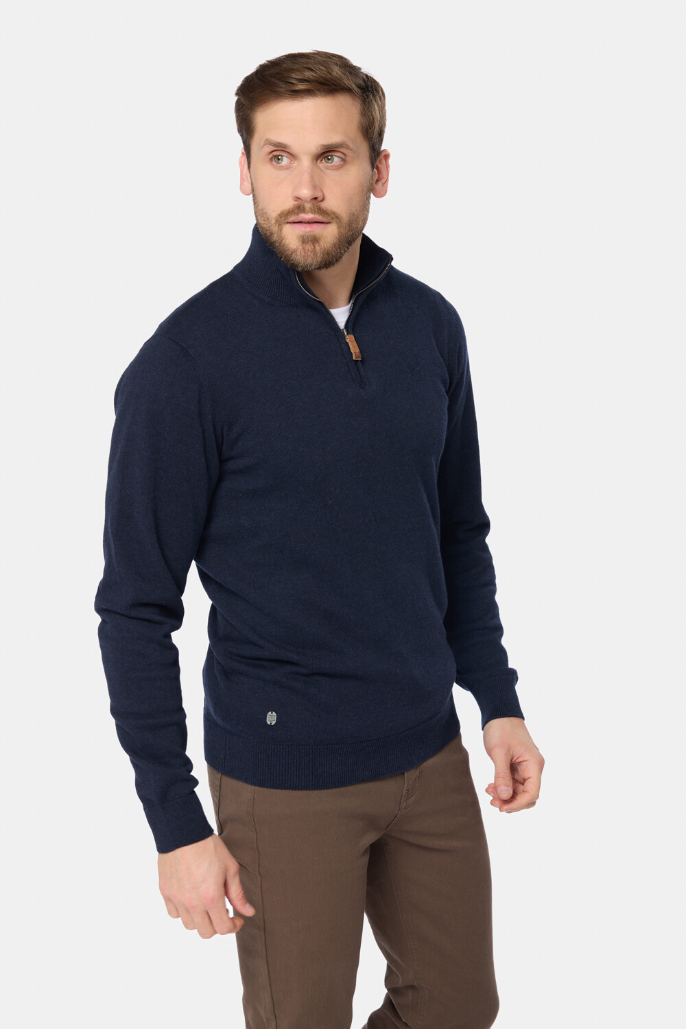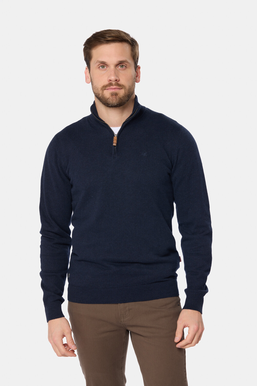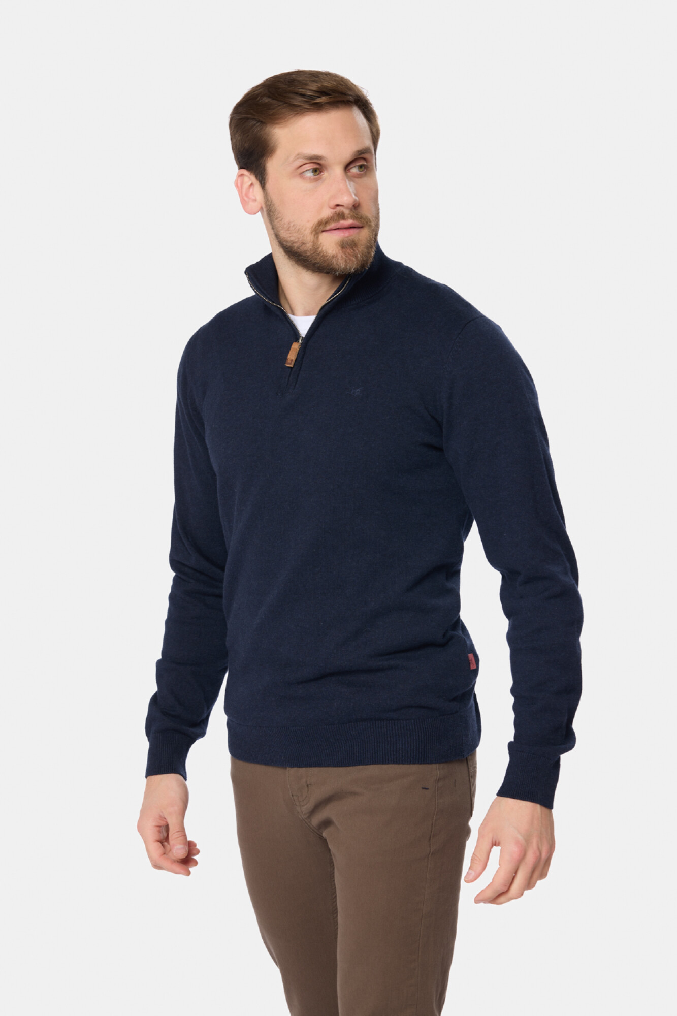 Buzo liso tejido fino en hilo de algodón. Cuello con cierre con detalle en cuero. El modelo mide 1,82 m y usa talle M.