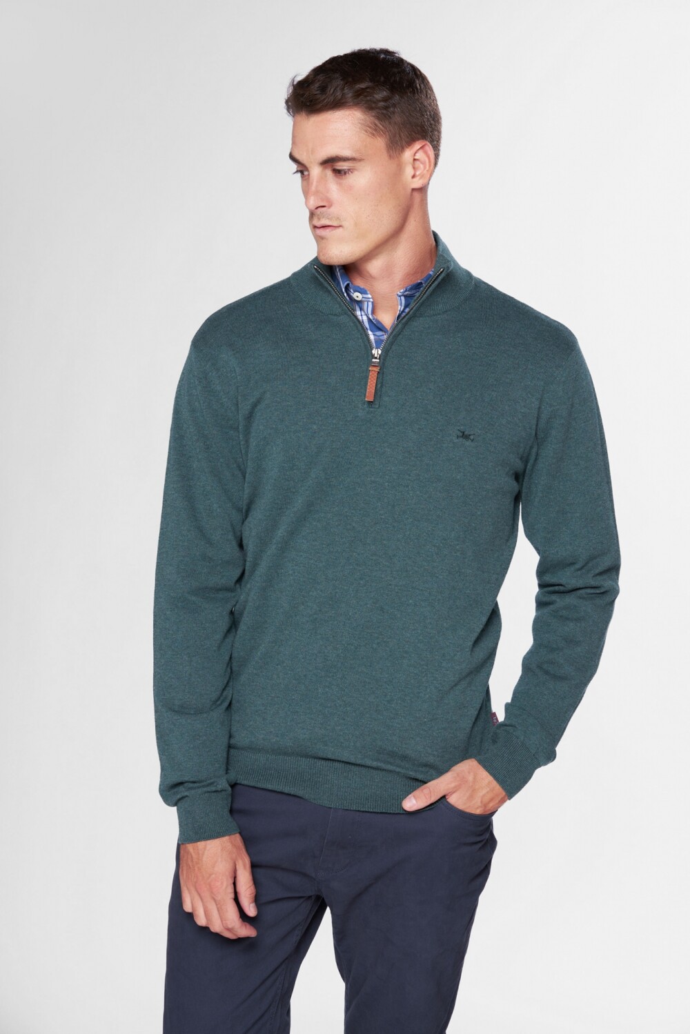 Buzo liso tejido fino en hilo de algodón. Cuello con cierre con detalle en cuero. El modelo mide 1,82 m y usa talle M.