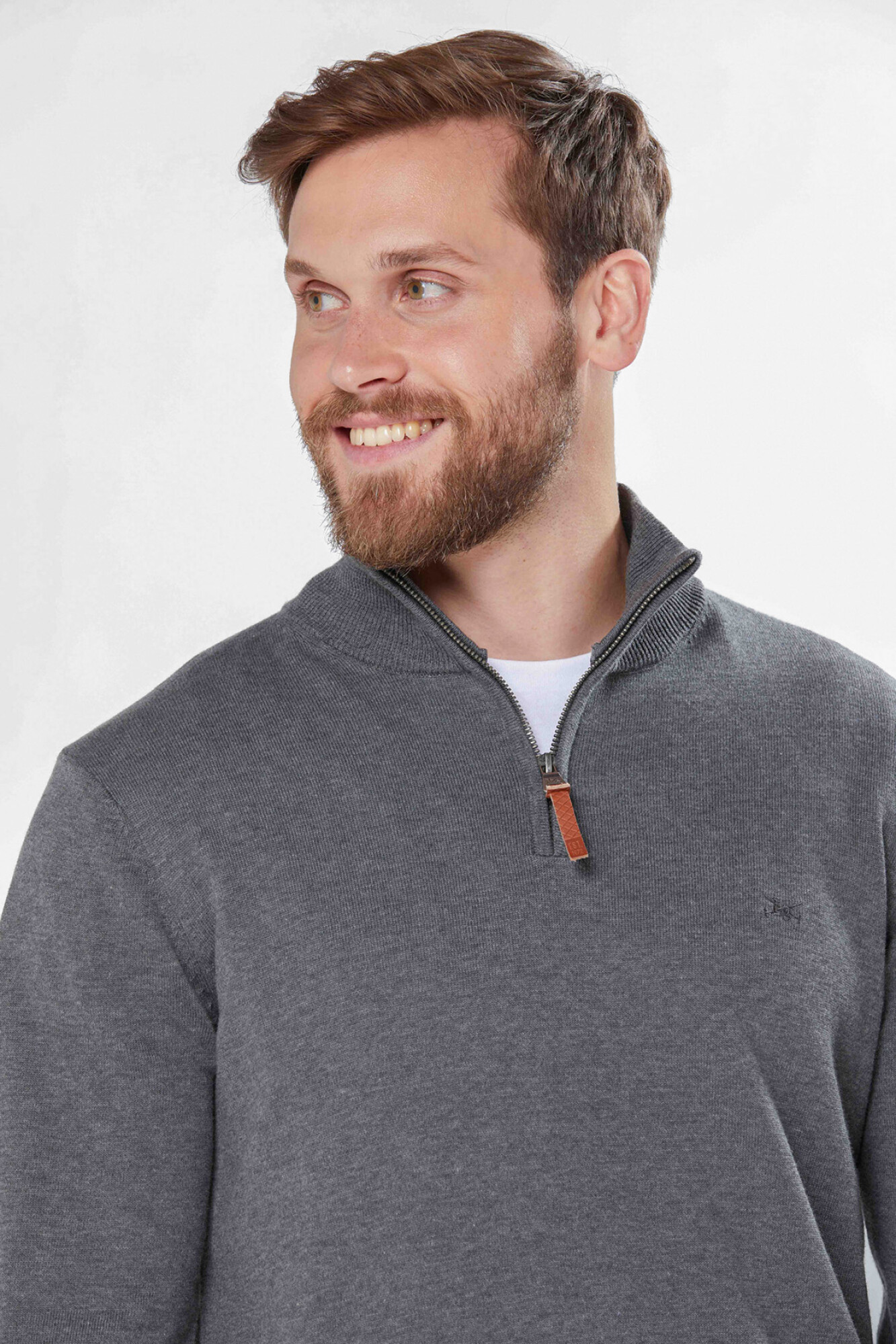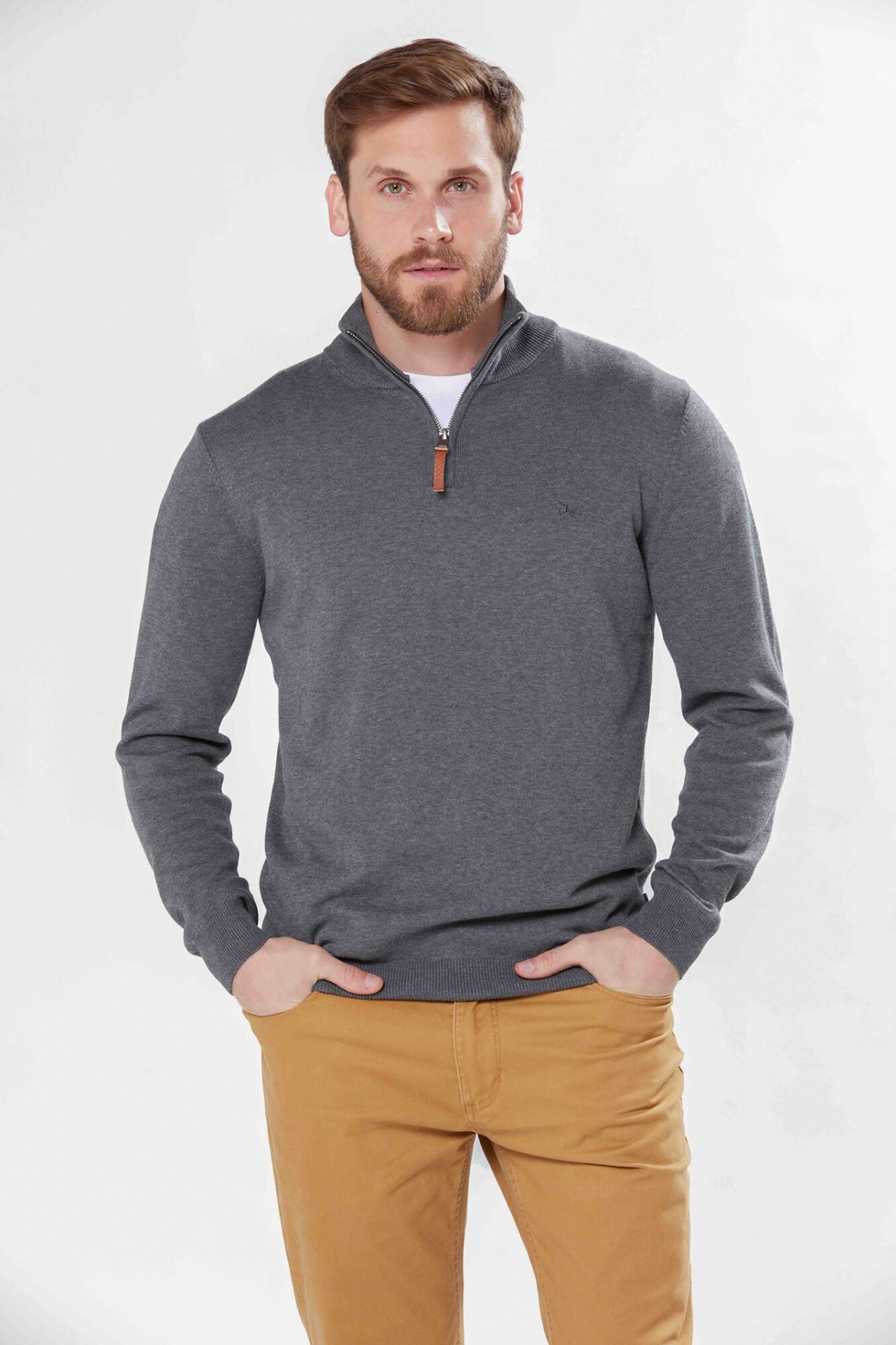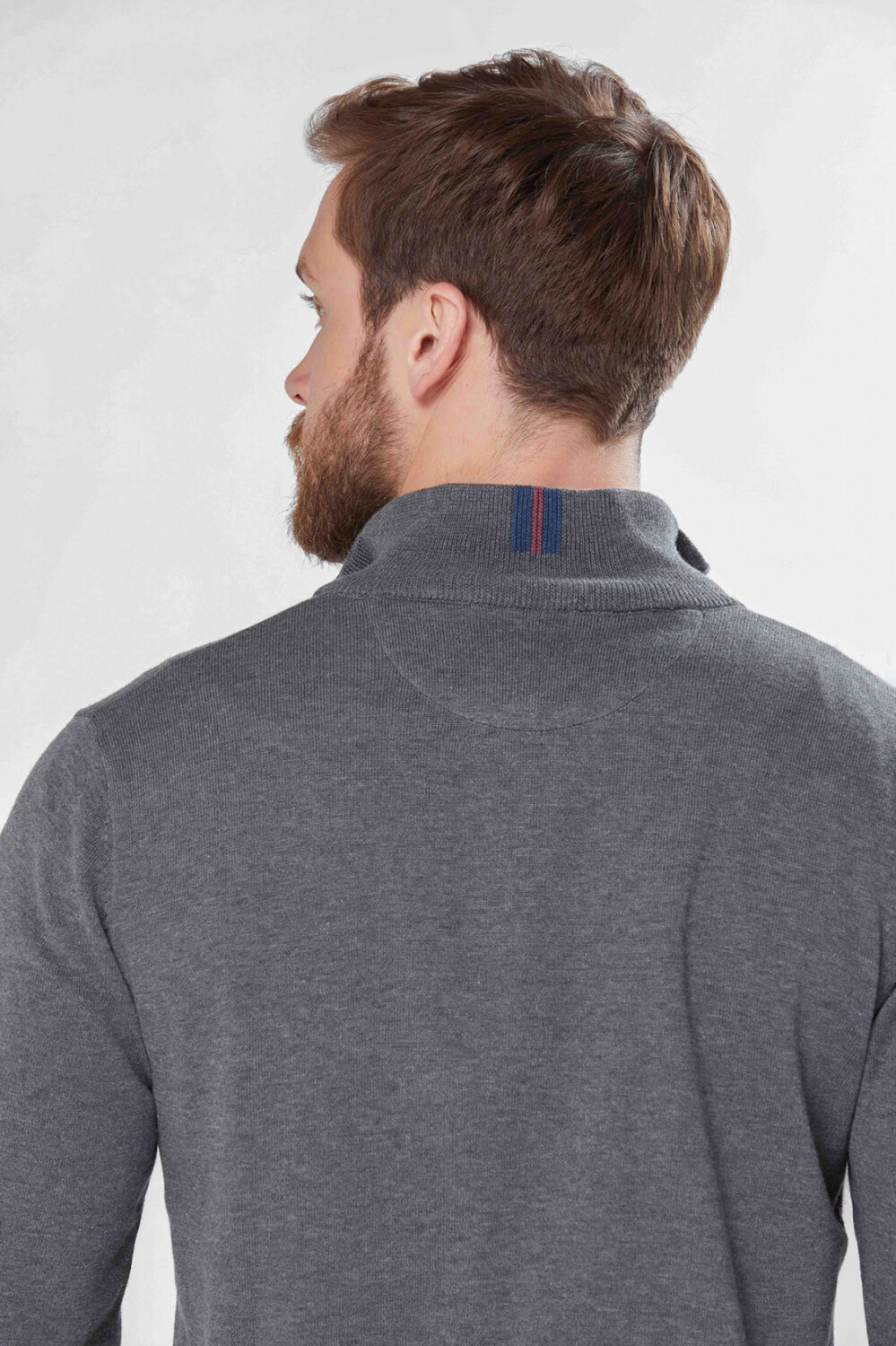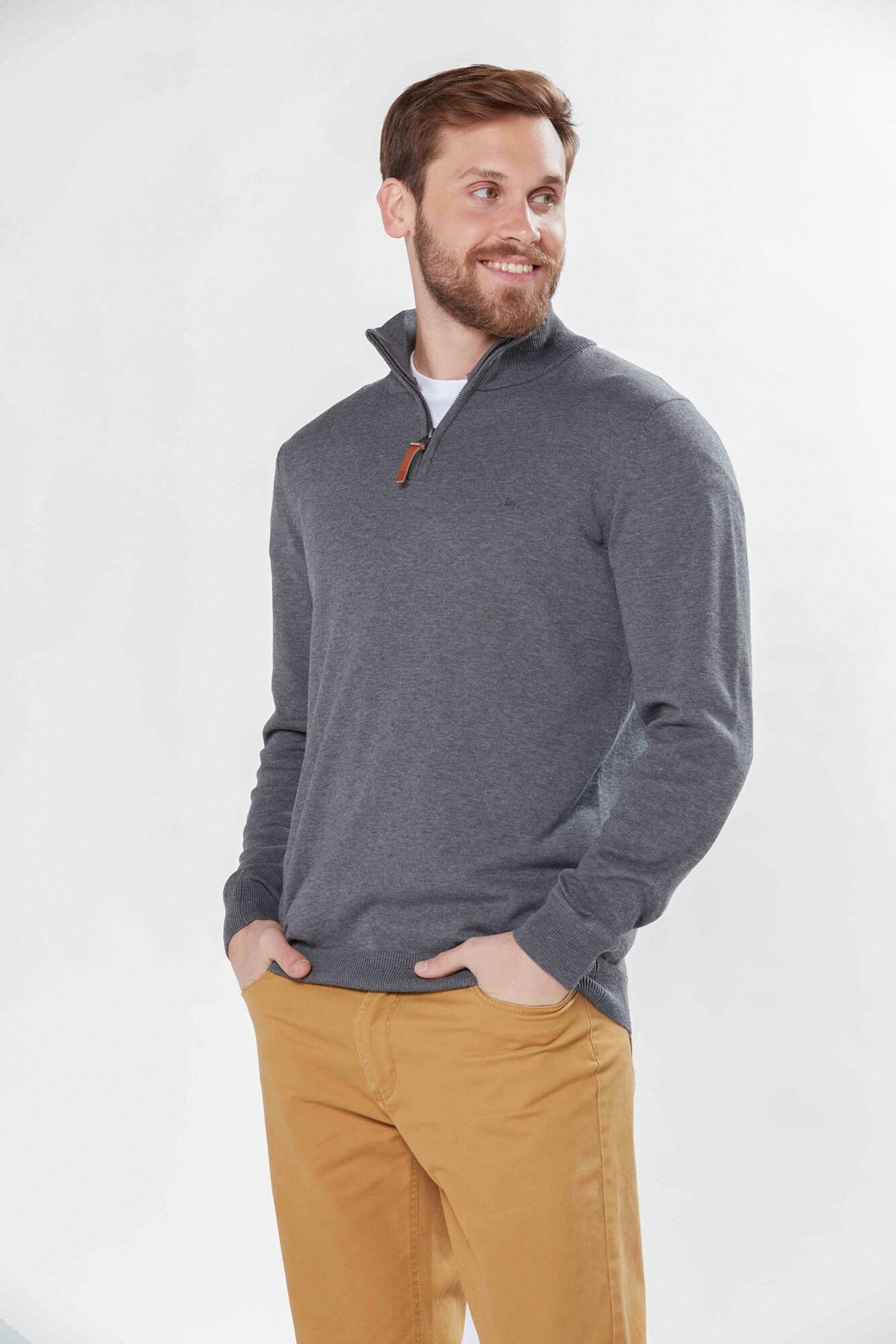 Buzo liso tejido fino en hilo de algodón. Cuello con cierre con detalle en cuero. El modelo mide 1,82 m y usa talle M.