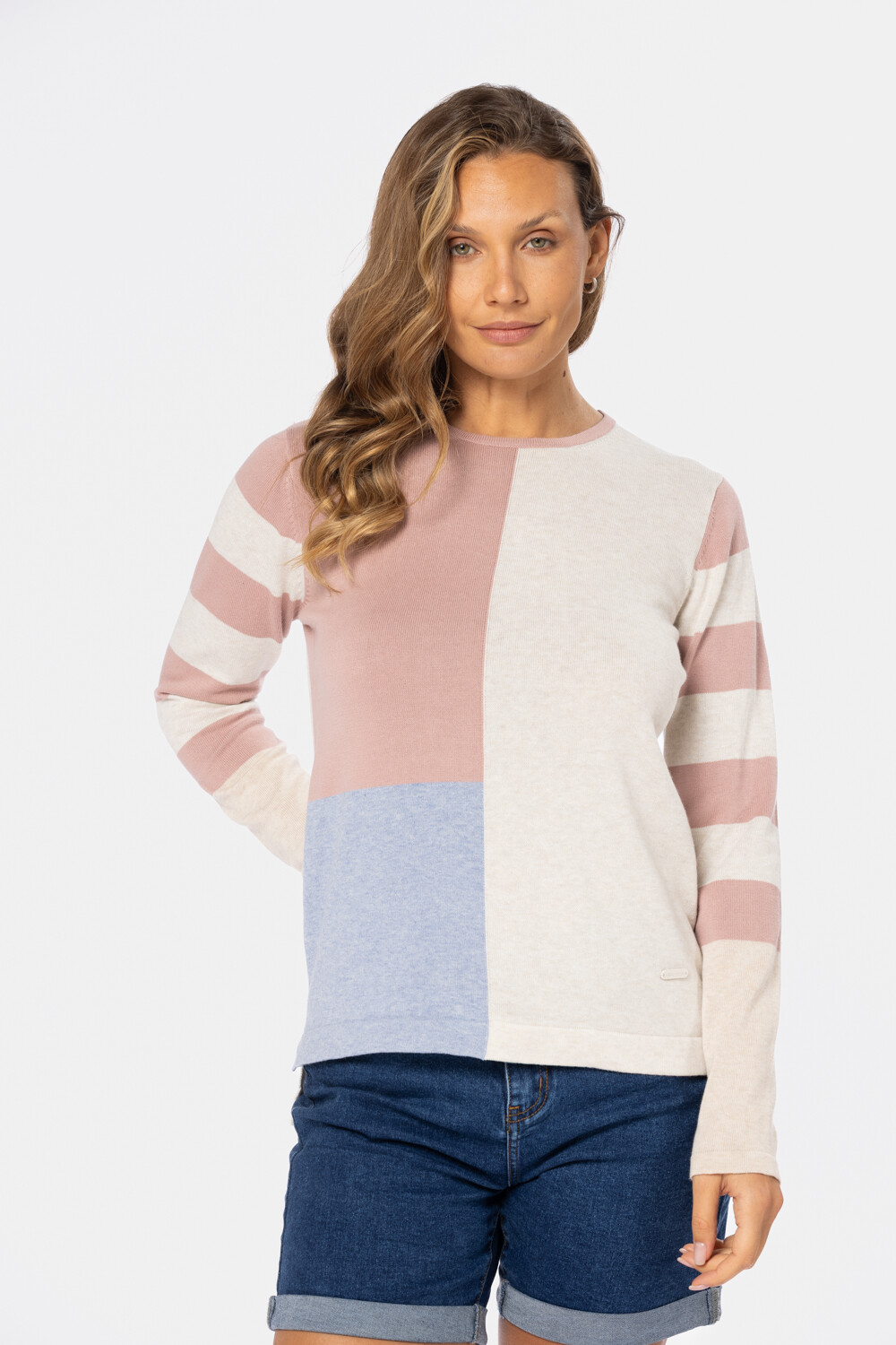 Buzo tejido fino a rayas combinado, confeccionado en algodón