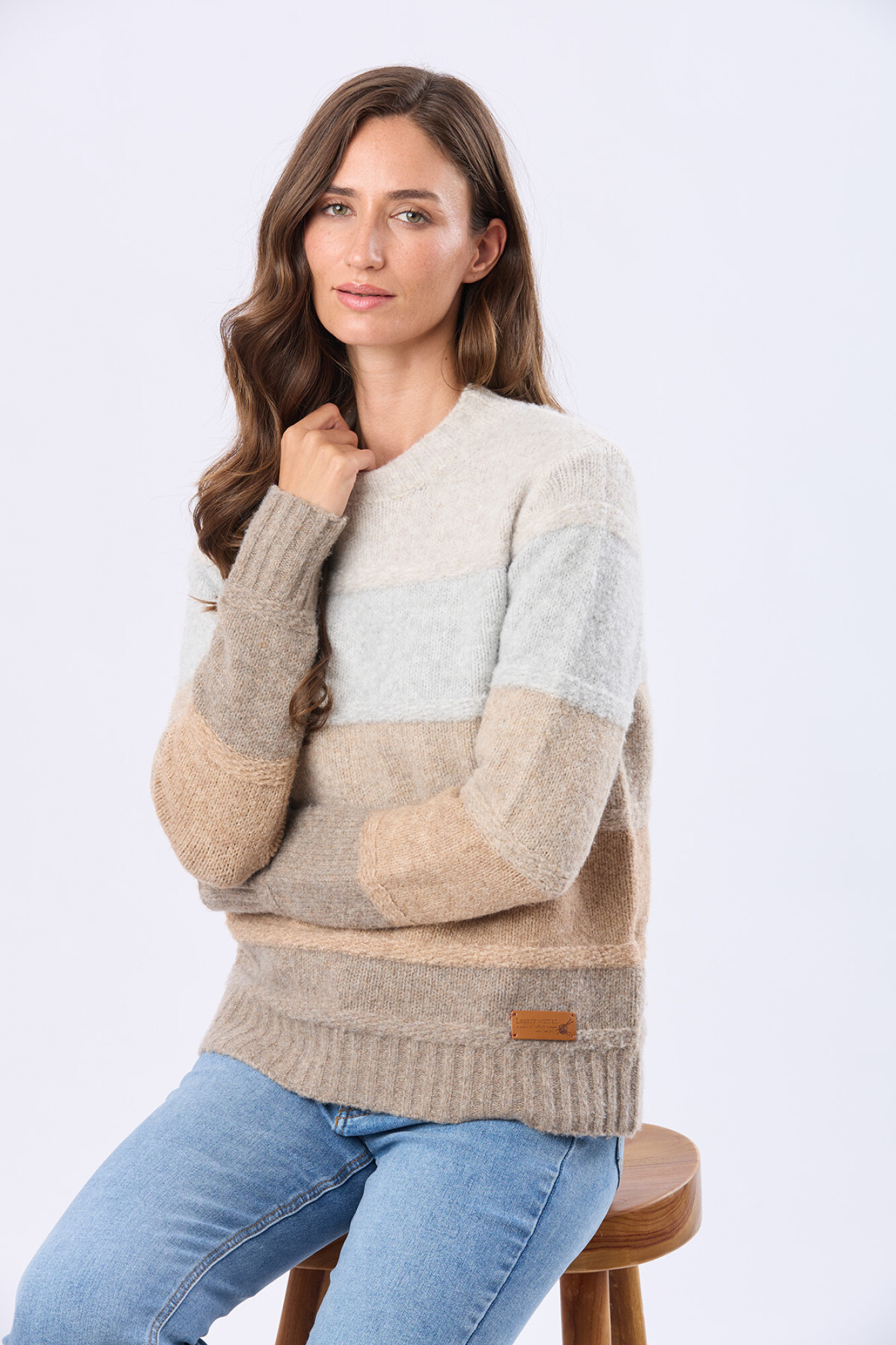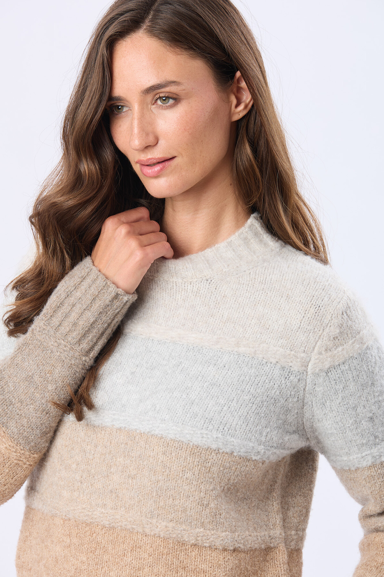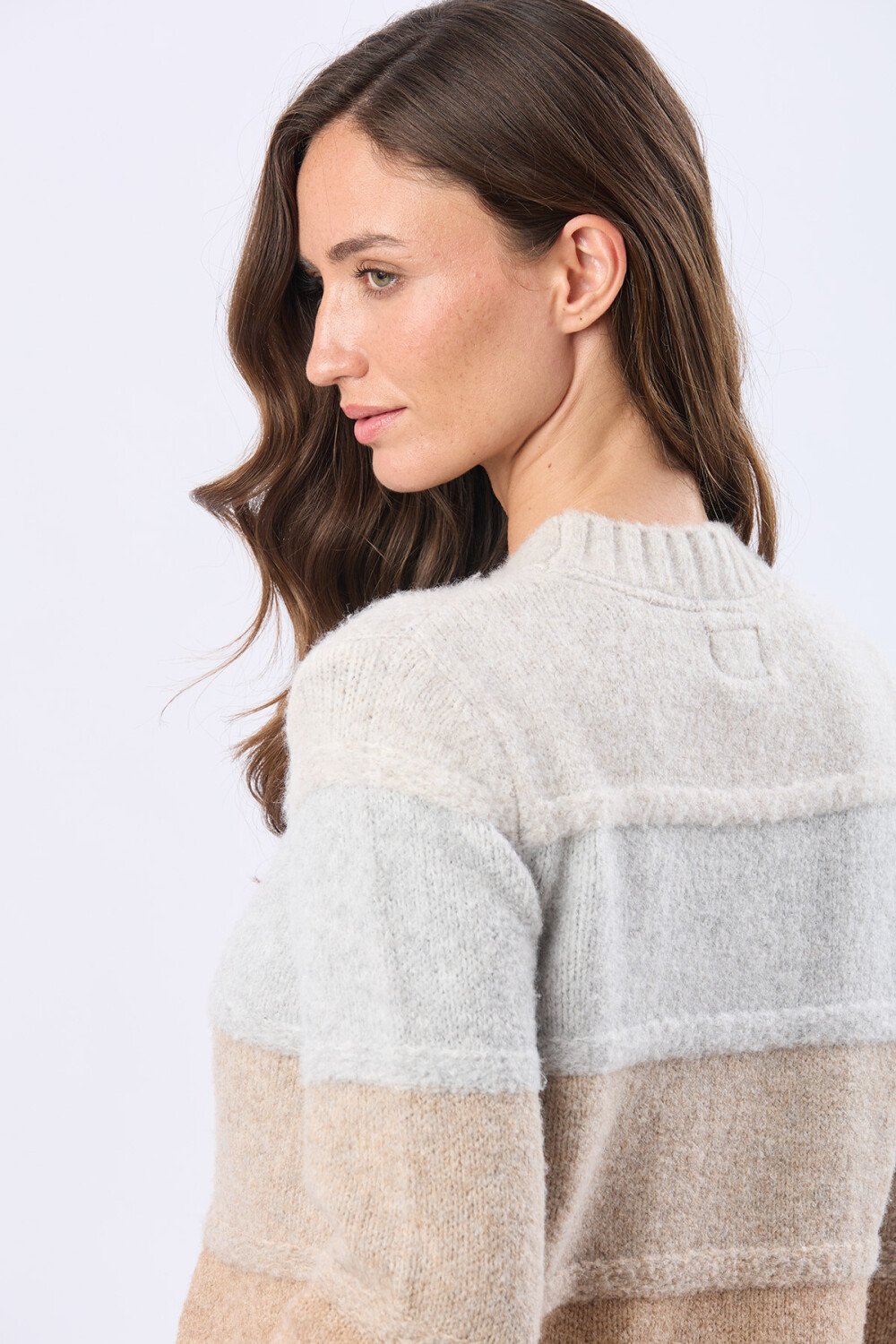 Buzo tejido rayado: Tu favorito para el frío. De tacto suave y calidez real, su corte favorece la silueta en cualquier ocasión, desde el home office hasta una salida casual. Un abrigo esencial con estilo. La modelo mide 1,70 m y usa talle S.