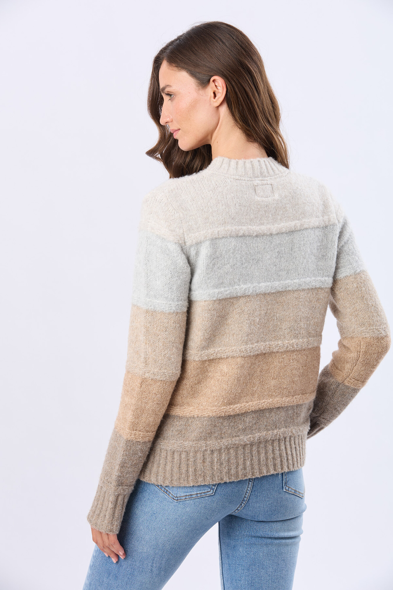 Buzo tejido de abrigo, diseño a rayas y cuello redondo. De tacto suave . Un abrigo esencial con estilo. La modelo mide 1,70 m y usa talle S.