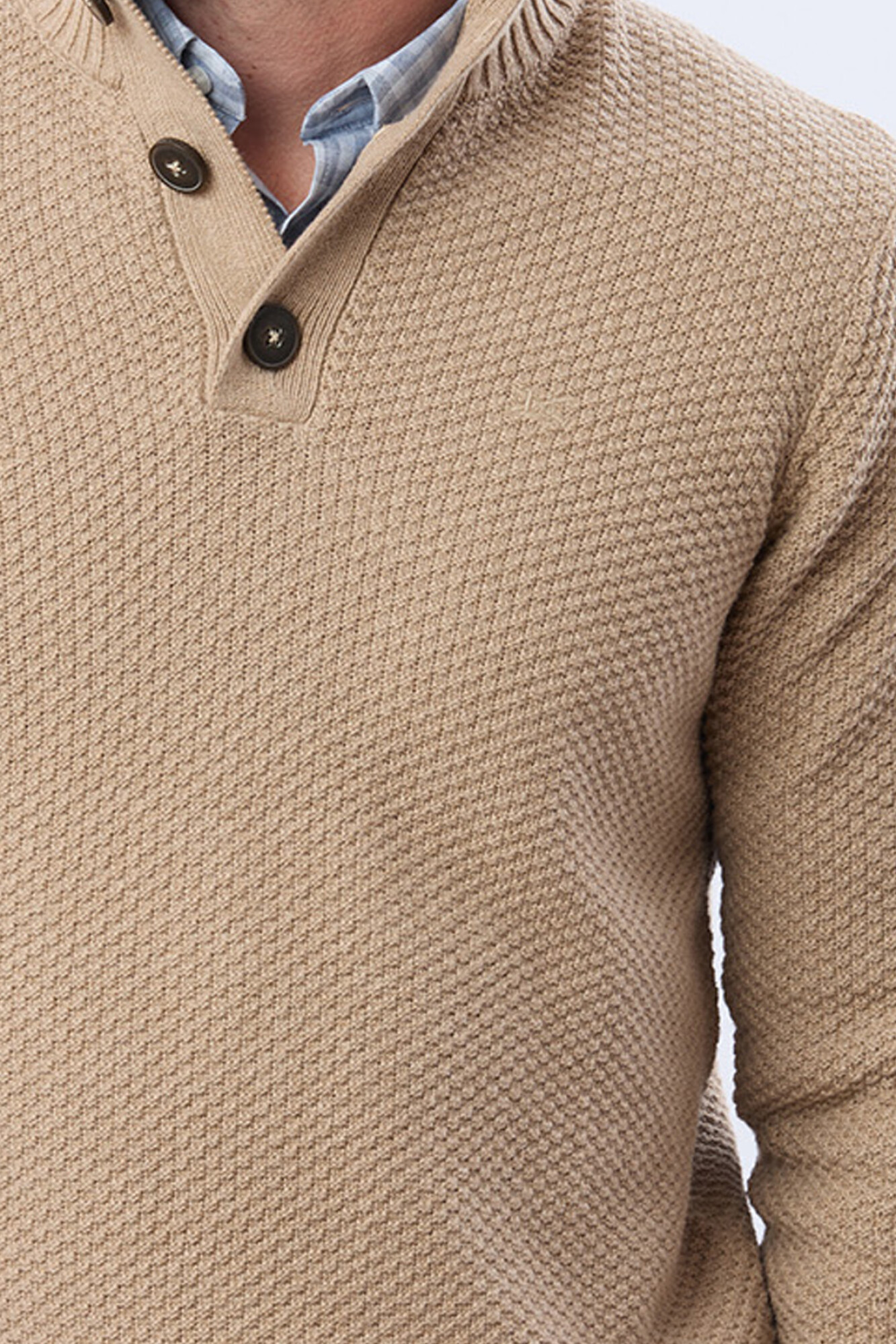 Buzo tejido liso, texturado con cuello con botones. Tu aliado para este invierno. Versátil para casa o salidas casuales, su confección de calidad lo hace duradero. El modelo mide 1,82 m y usa talle M.