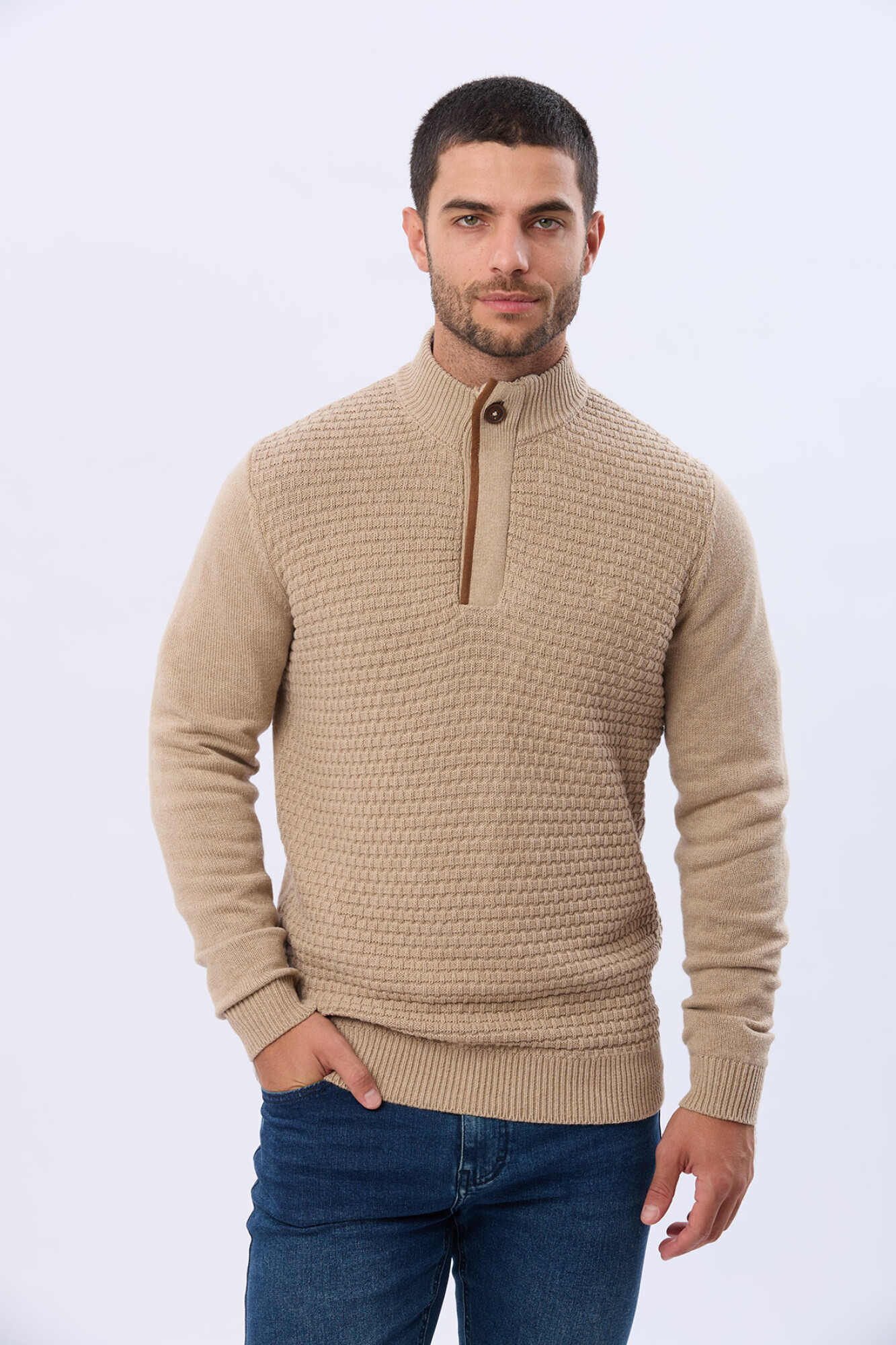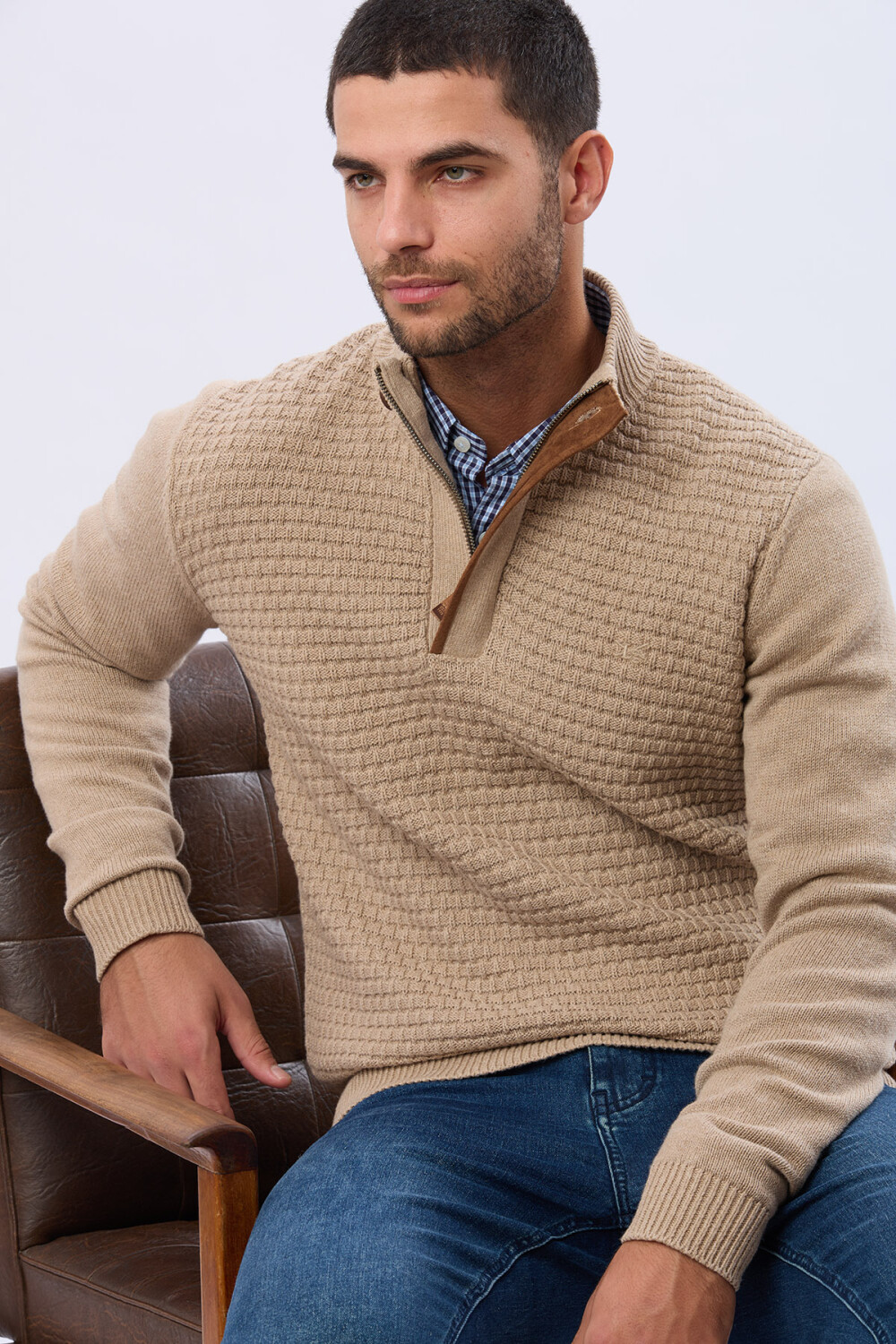 Buzo liso de abrigo en tejido grueso texturado, diseñado para combatir las bajas temperaturas. Cuello con cierre con detalle en gamuza. Estilo versátil, ideal para un look de invierno definido y confortable. El modelo mide 1,82 m y usa talle M.