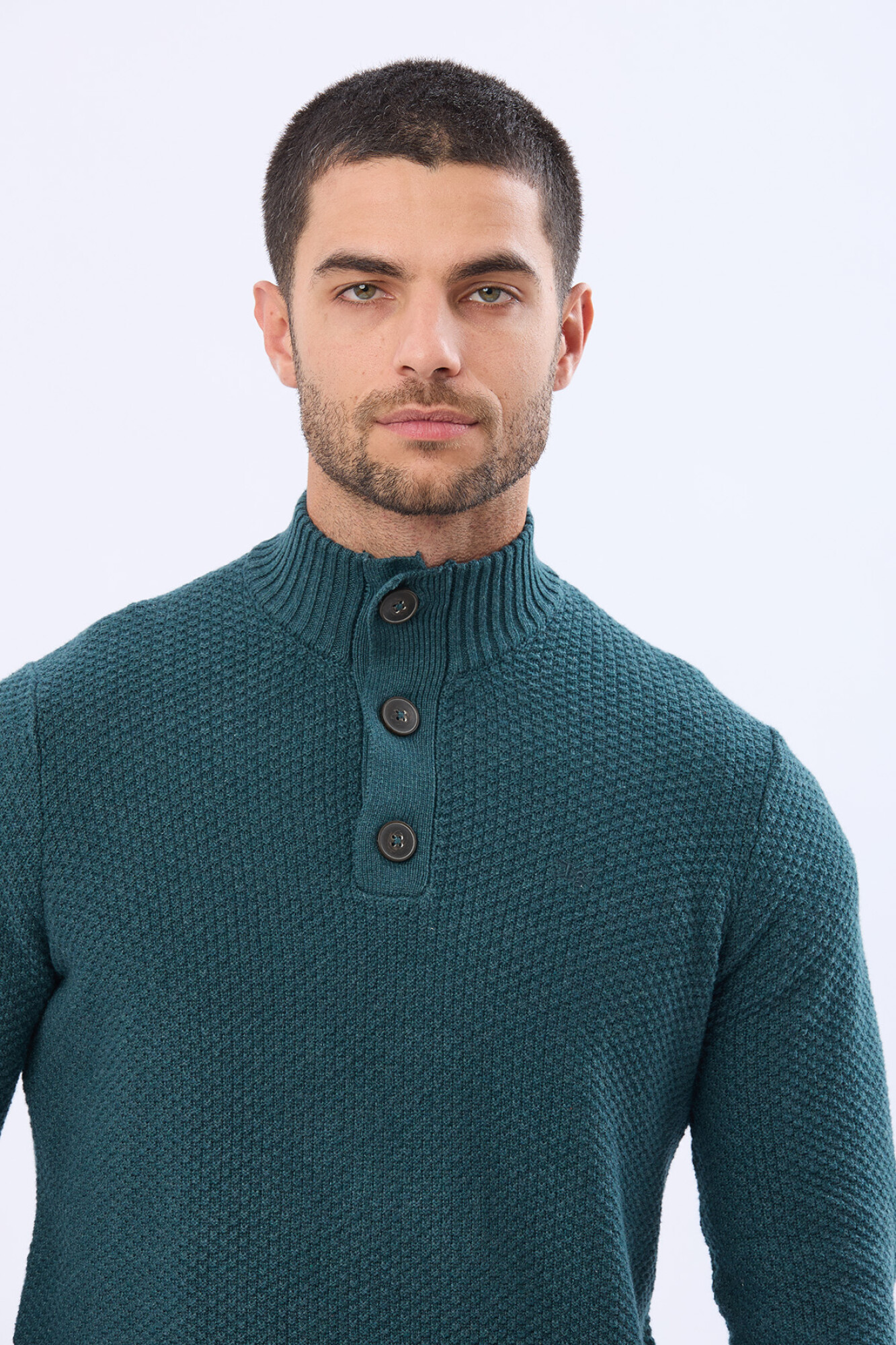 Buzo tejido liso, texturado con cuello con botones. Tu aliado para este invierno. Versátil para casa o salidas casuales, su confección de calidad lo hace duradero. El modelo mide 1,82 m y usa talle M.
