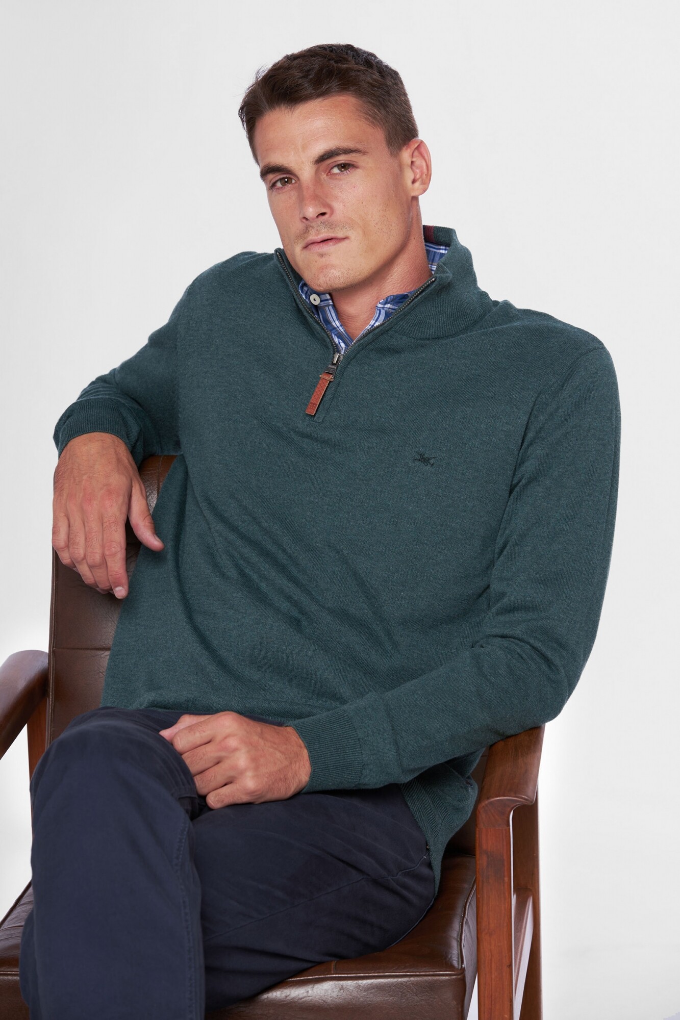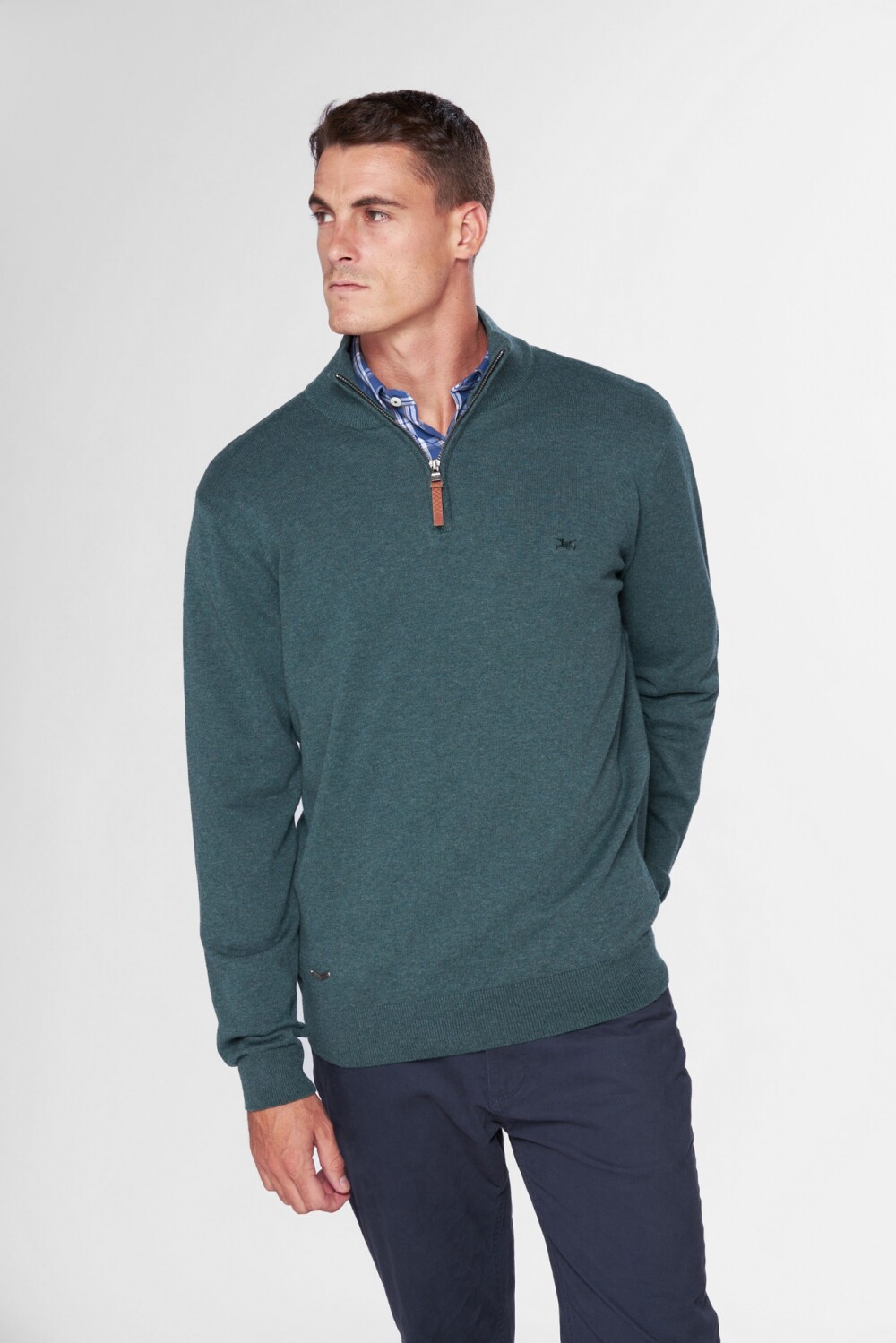 Buzo liso tejido fino en hilo de algodón. Cuello con cierre con detalle en cuero. El modelo mide 1,82 m y usa talle M.