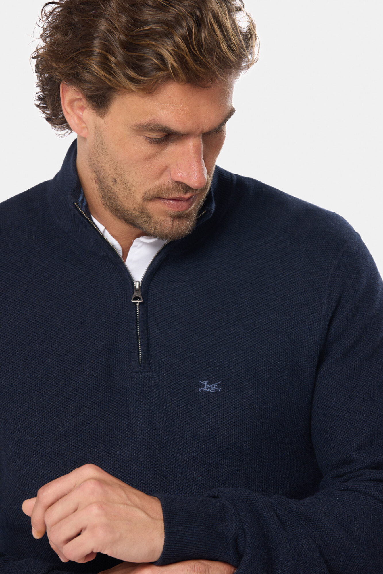 Buzo liso medio cierre texturado con detalle en cuero ecológico confeccionado 100% en algodón