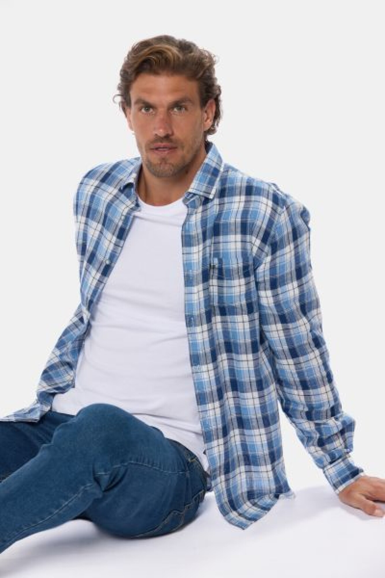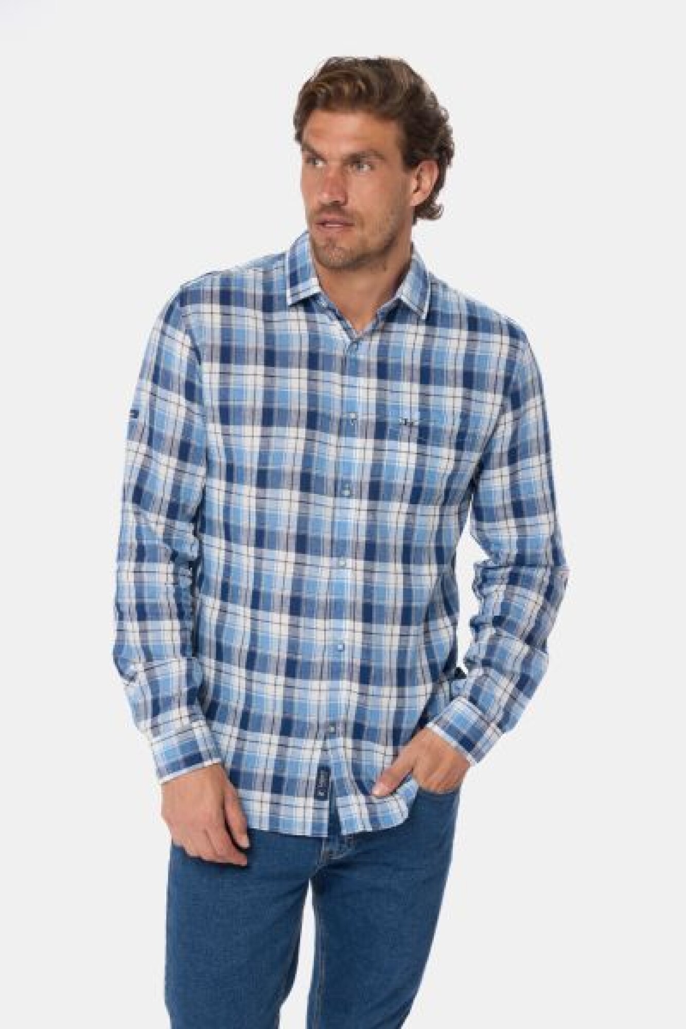 Camisa a cuadros manga larga de lino, con bolsillo y logo bordado