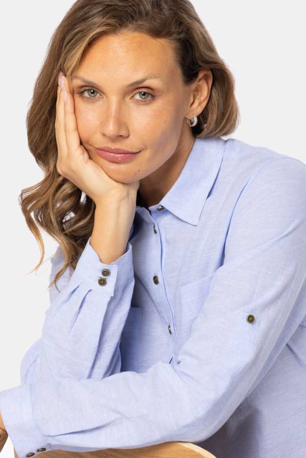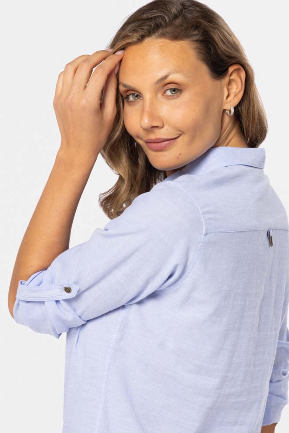 Camisa lisa de Lino manga larga medio botón. Tiene bolsillos en el pecho, botones metálicos personalizados y presilla en la manga para mayor comodidad.