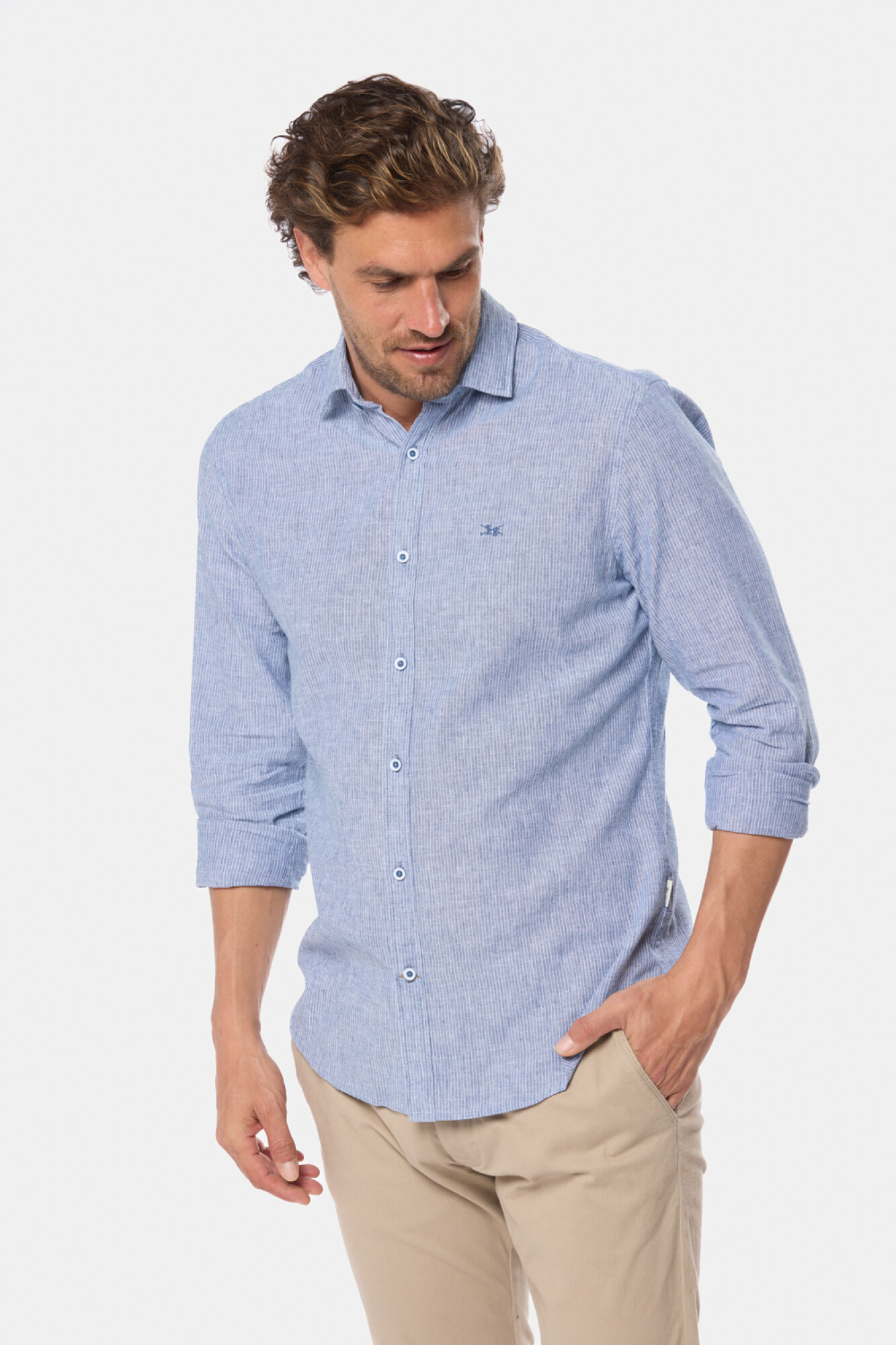 Camisa de lino rayada manga larga ,modelo slim sin bolsillo