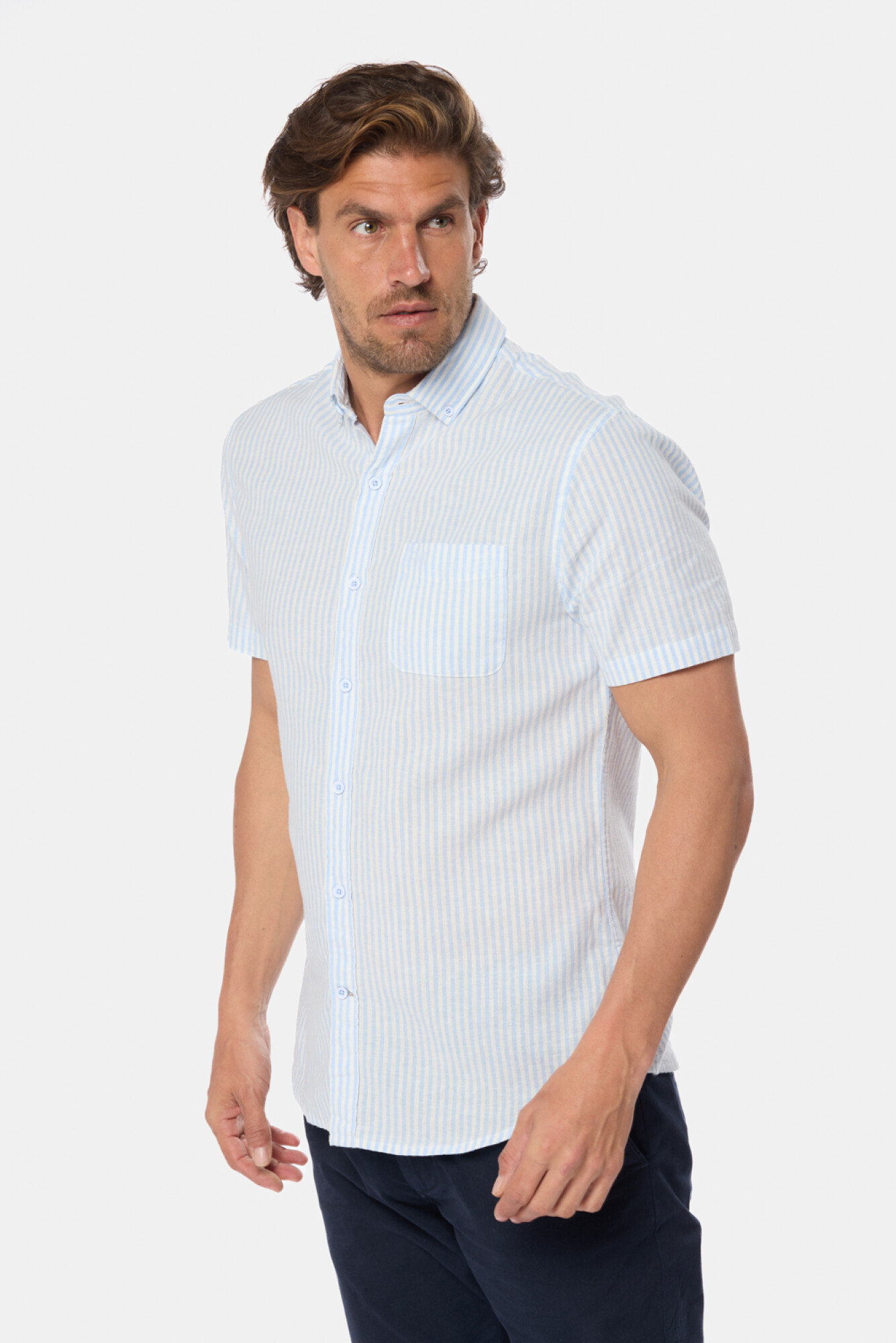 Camisa de lino rayada manga corta, modelo slim fit y con bolsillo