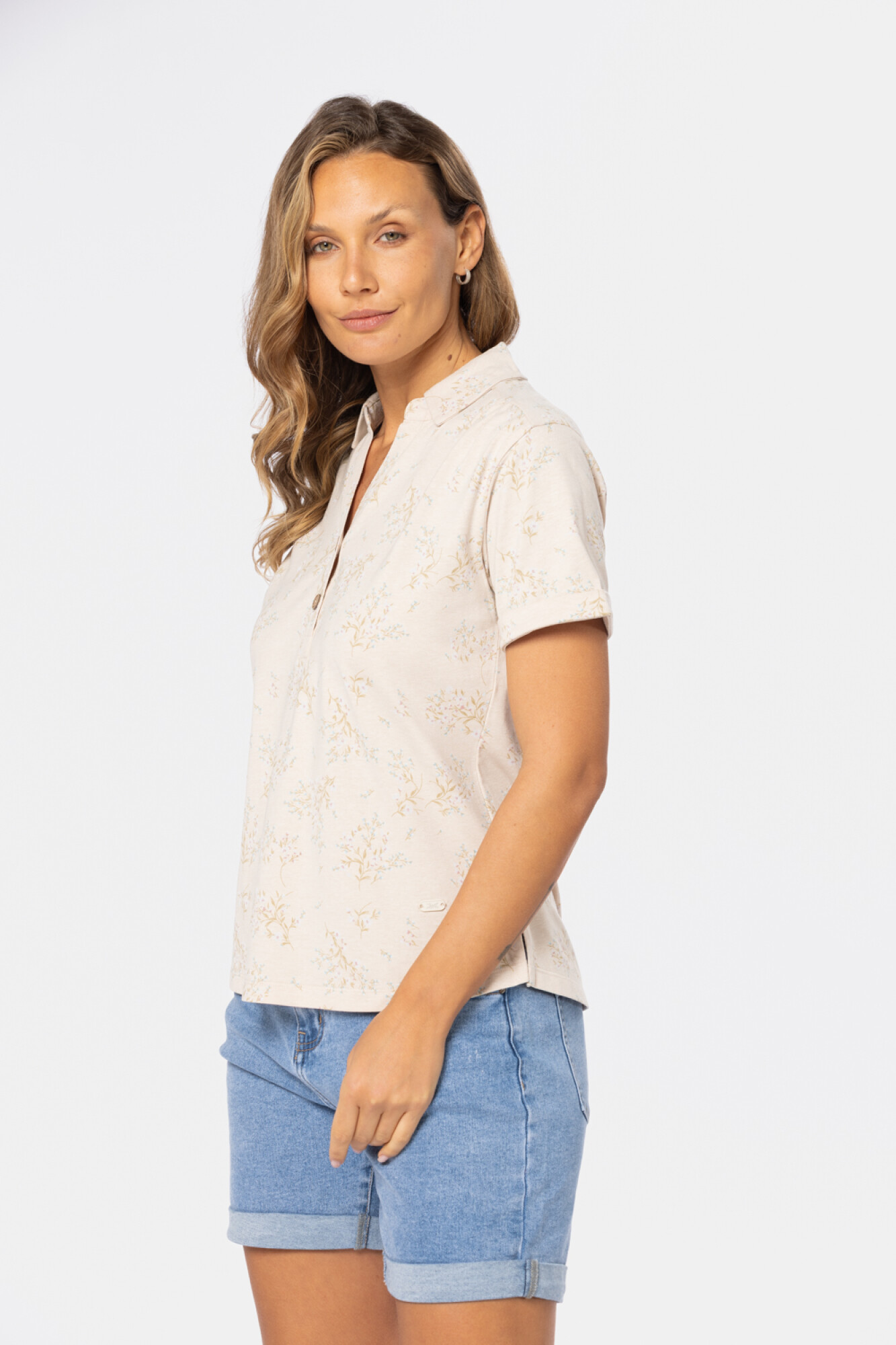 Camisa manga corta en jersey medio boton , estampado floral ,textura suave