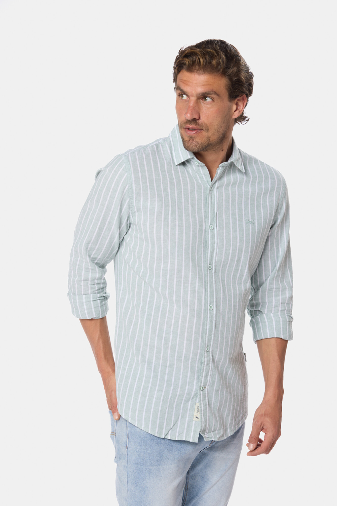 LegacyCAMISA RAYADA DE LINO - VerdeCamisa de lino rayada, slim fit con botones personalizados. Modelo 1 mide 1.84 y usa talle M. Modelo 2 mide 1.92 y usa talle L.L208A63MENTAhttps://legacy.com.uy/catalogo/camisa-rayada-de-lino-verde_L208A63_MENTA