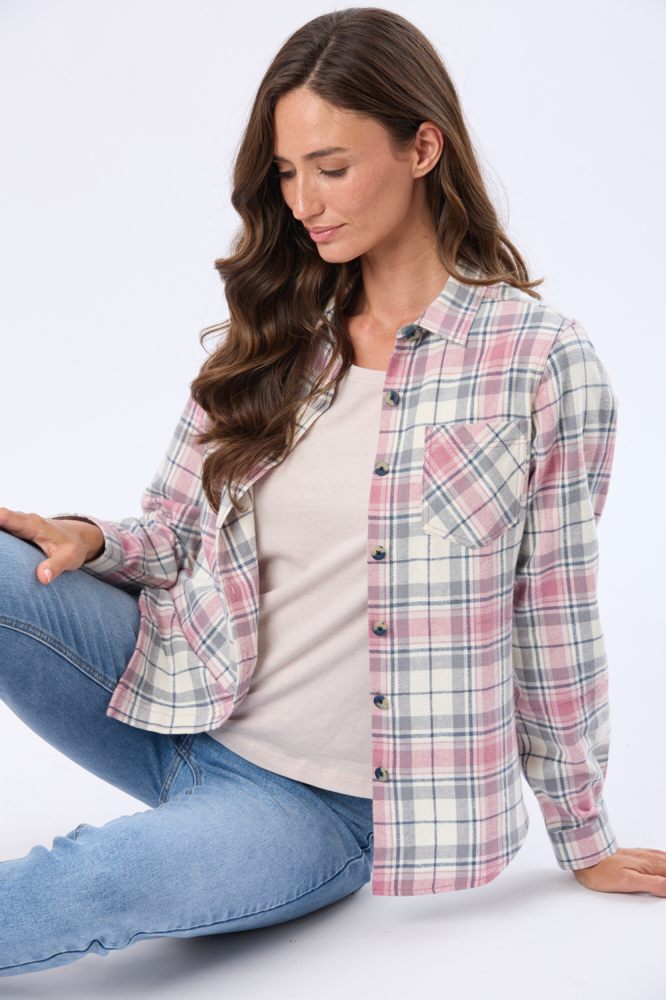 Camisa de viyela a cuadros ideal para los días frescos gracias a tu textura cálida y confortable .Cuenta con cuello camisero , cierre frontal con botones e incorpora un bolsillo en el pecho que suma un detalle practico