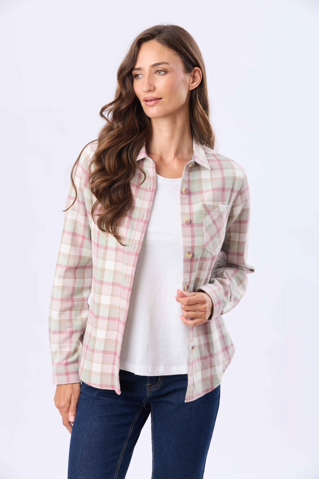 Camisa de viyela a cuadros ideal para los días frescos gracias a tu textura cálida y confortable .Cuenta con cuello camisero , cierre frontal con botones e incorpora un bolsillo en el pecho que suma un detalle practico