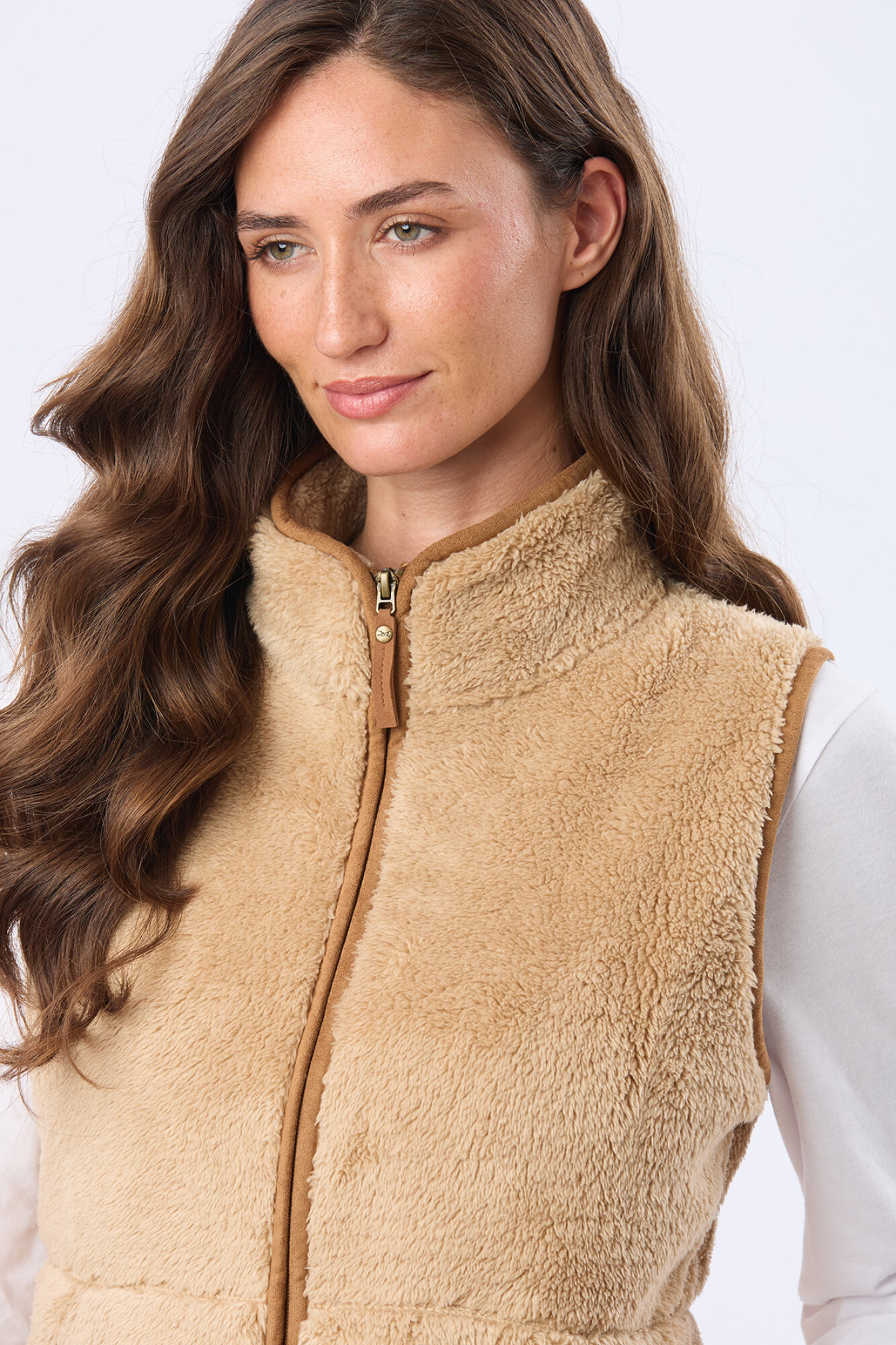Chaleco en tejido suave de sherpa con detalles en eco cuero, Abriga el torso donde más lo necesitás sin limitar el movimiento. La modelo mide 1,70 m y usa talle S.