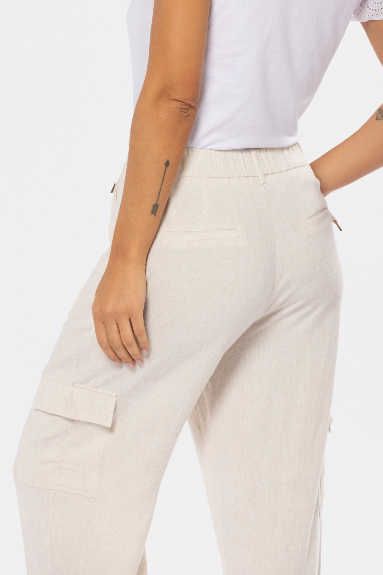 Pantalón cargo de lino con bolsillo laterales y media cintura elastizada