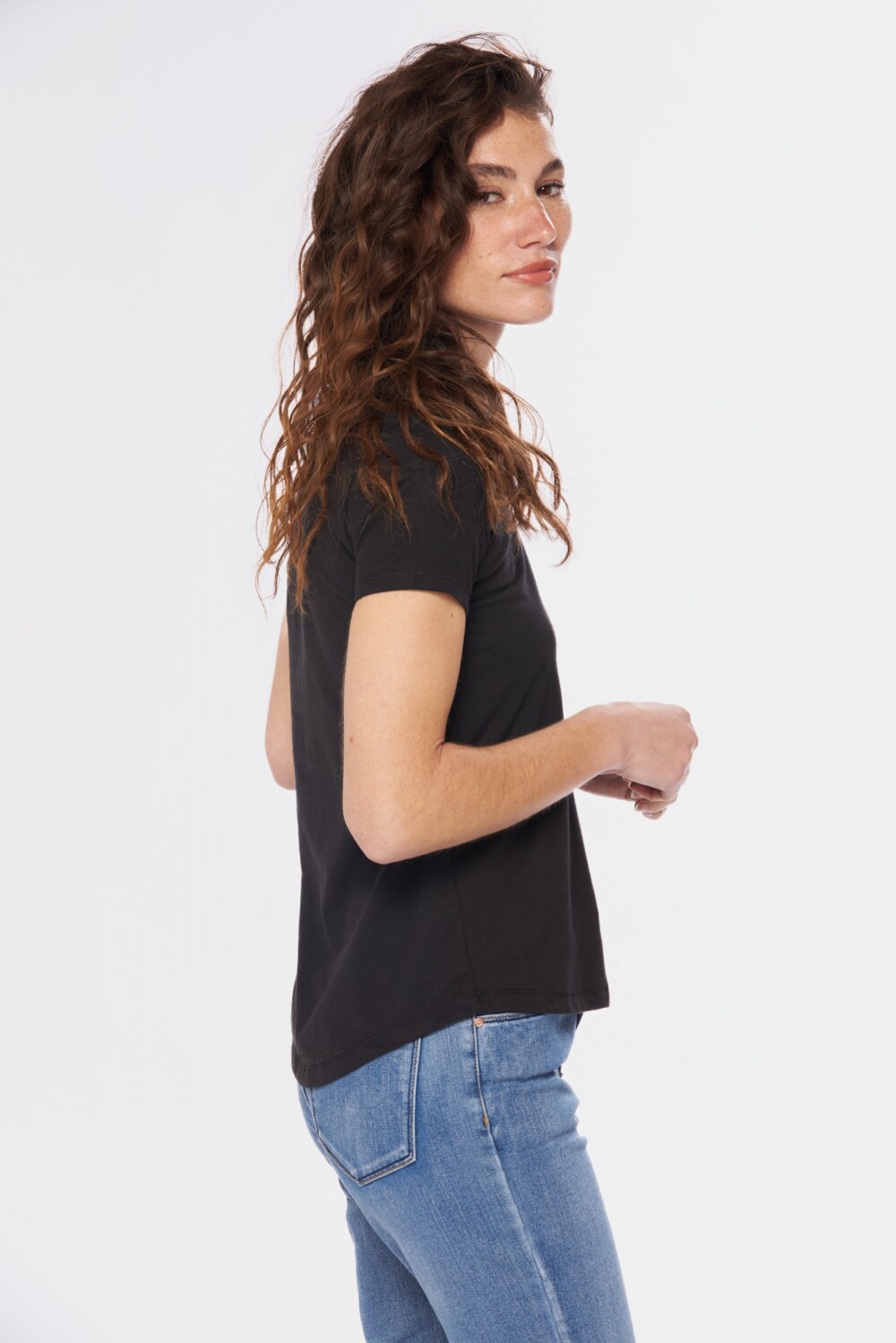 Remera T-Shirt lisa manga corta, escote redondo con bolsillo y más larga en espalda.