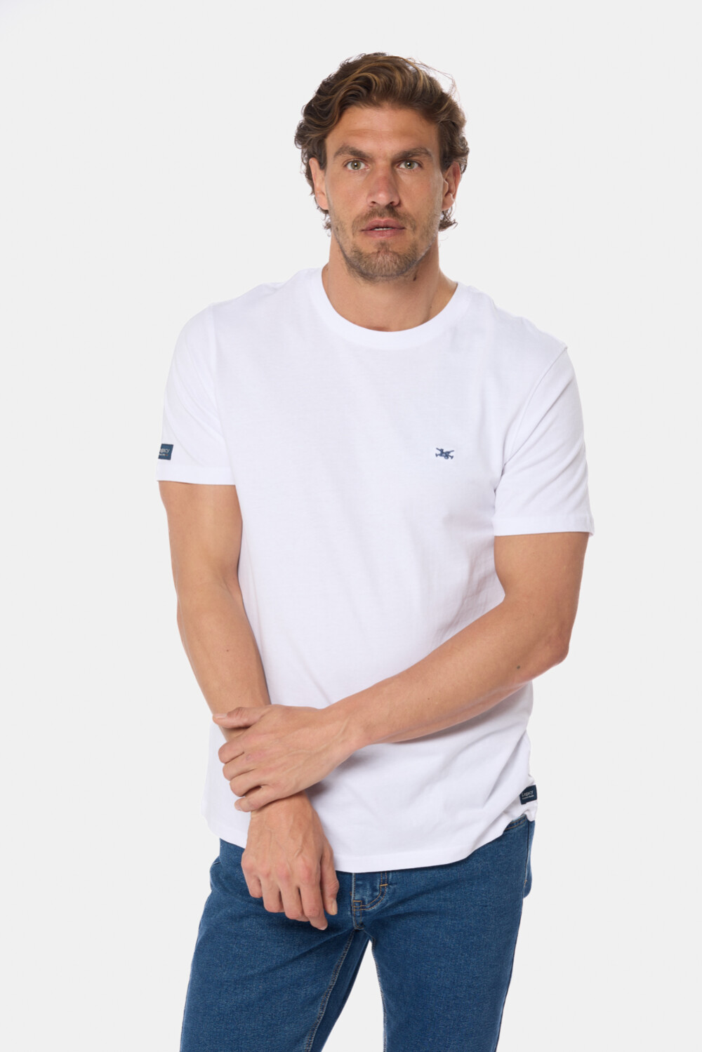 Remera T-Shirt básica de algodón , manga corta, con logo bordado al frente. De calce cómodo y fácil de combinar. El modelo mide 1,85 m y usa talle M.