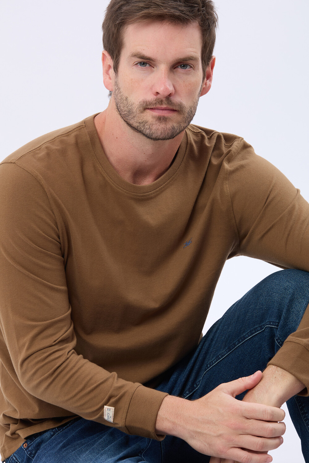 Remera T-Shirt básica de algodón de manga larga. Escote a la base con logo bordado al frente. De calce cómodo y fácil de combinar. El modelo mide 1,85 m y usa talle M.