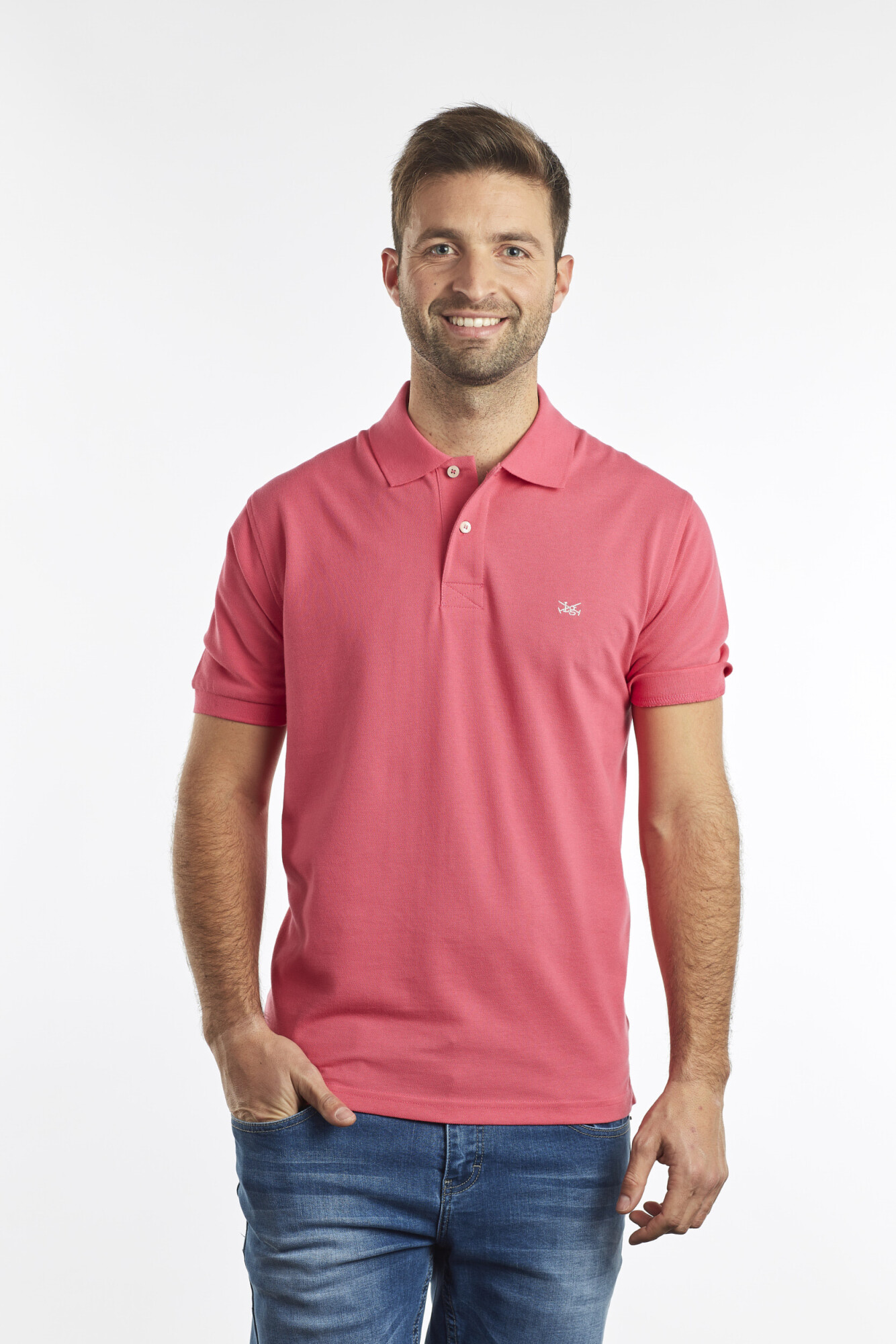Polo pique color liso, cuello en rib y bordado contrastante.