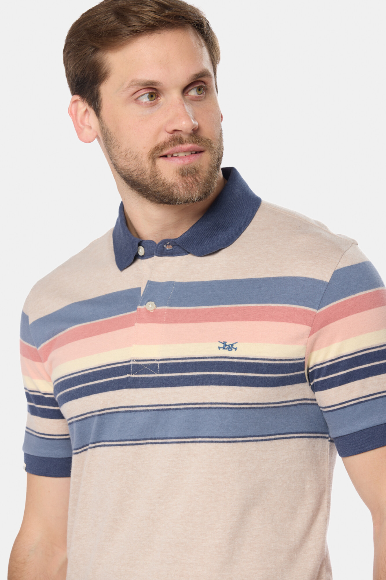 Remera polo rayada en pique multicolor. Botones personalizados y logo en el pecho