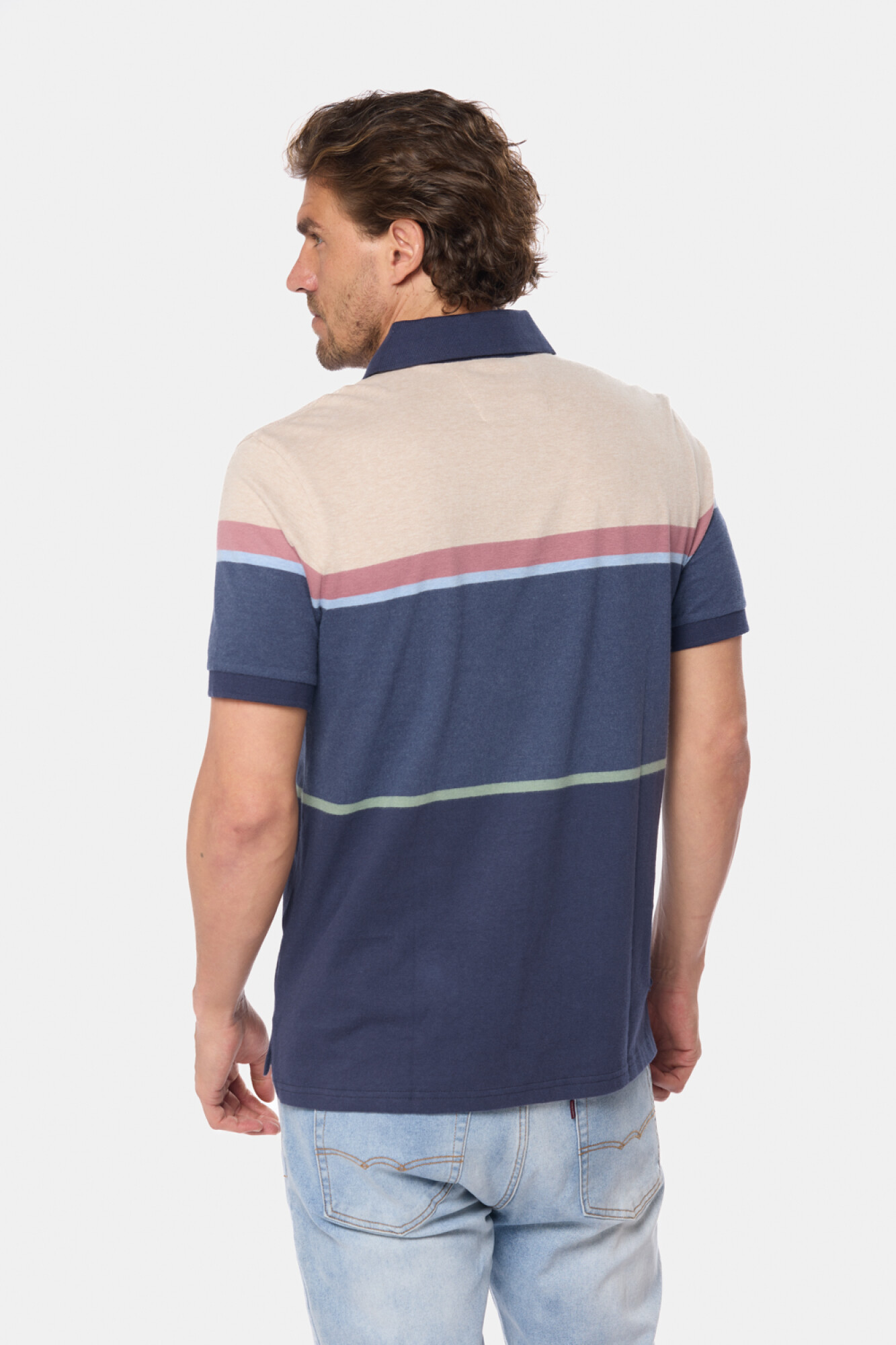 Remera polo rayada. Botones personalizados y logo en el pecho.