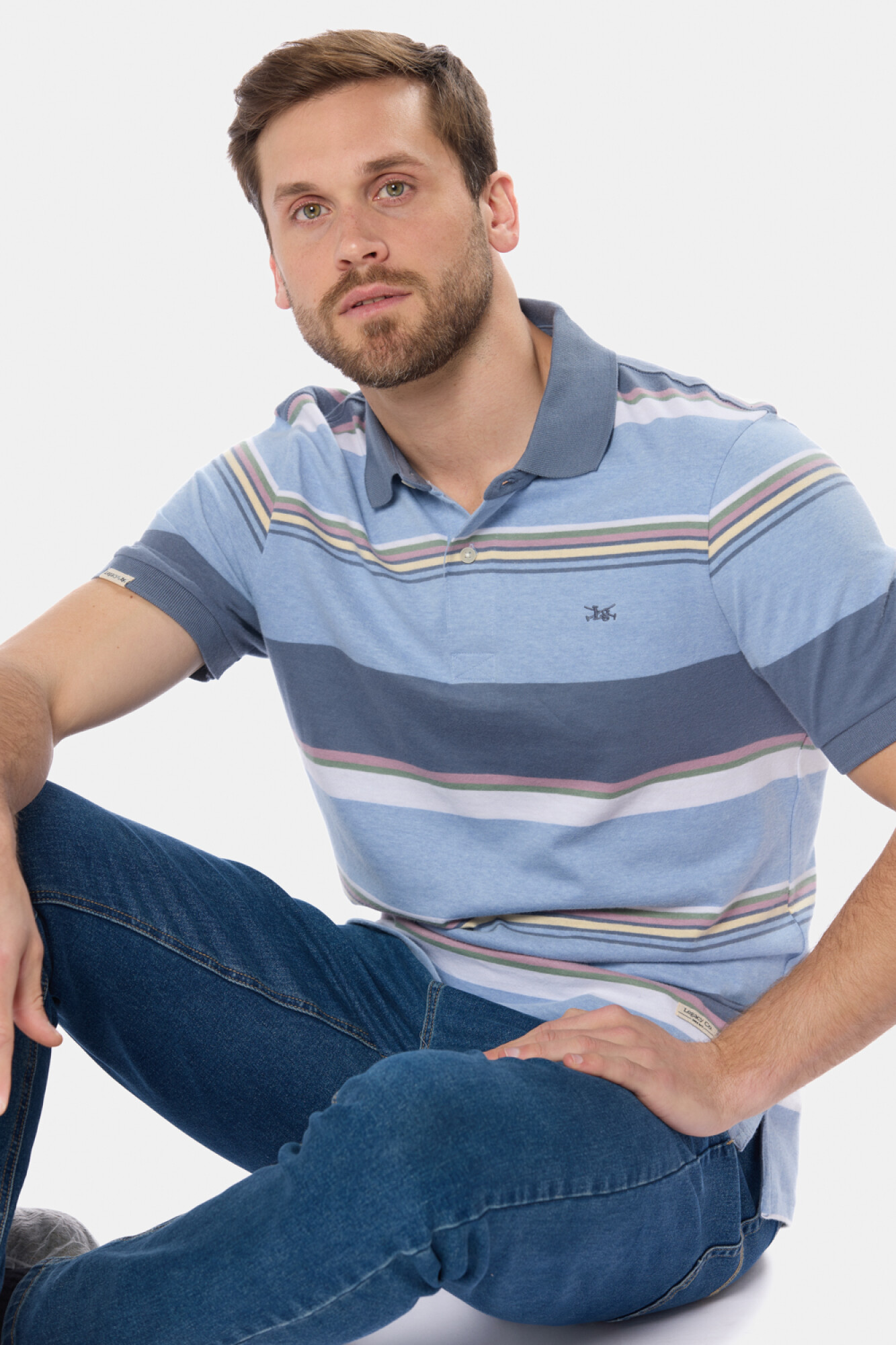 Remera polo rayada . Botones personalizados y logo en el pecho.