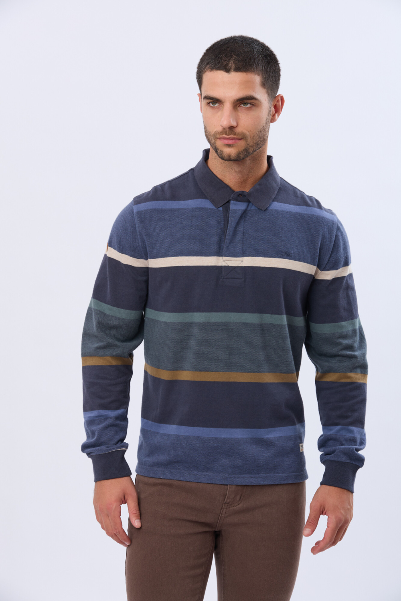 Remera polo manga larga rayada, con un diseño de rayas horizontales en distintos tonos cuello clásico con botones personalizados