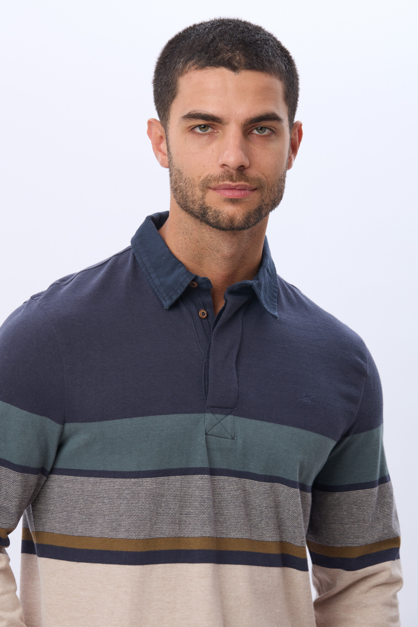 Remera polo manga larga en algodón combinada de colores en franjas horizontales ideal para un look casual con un toque distintivo