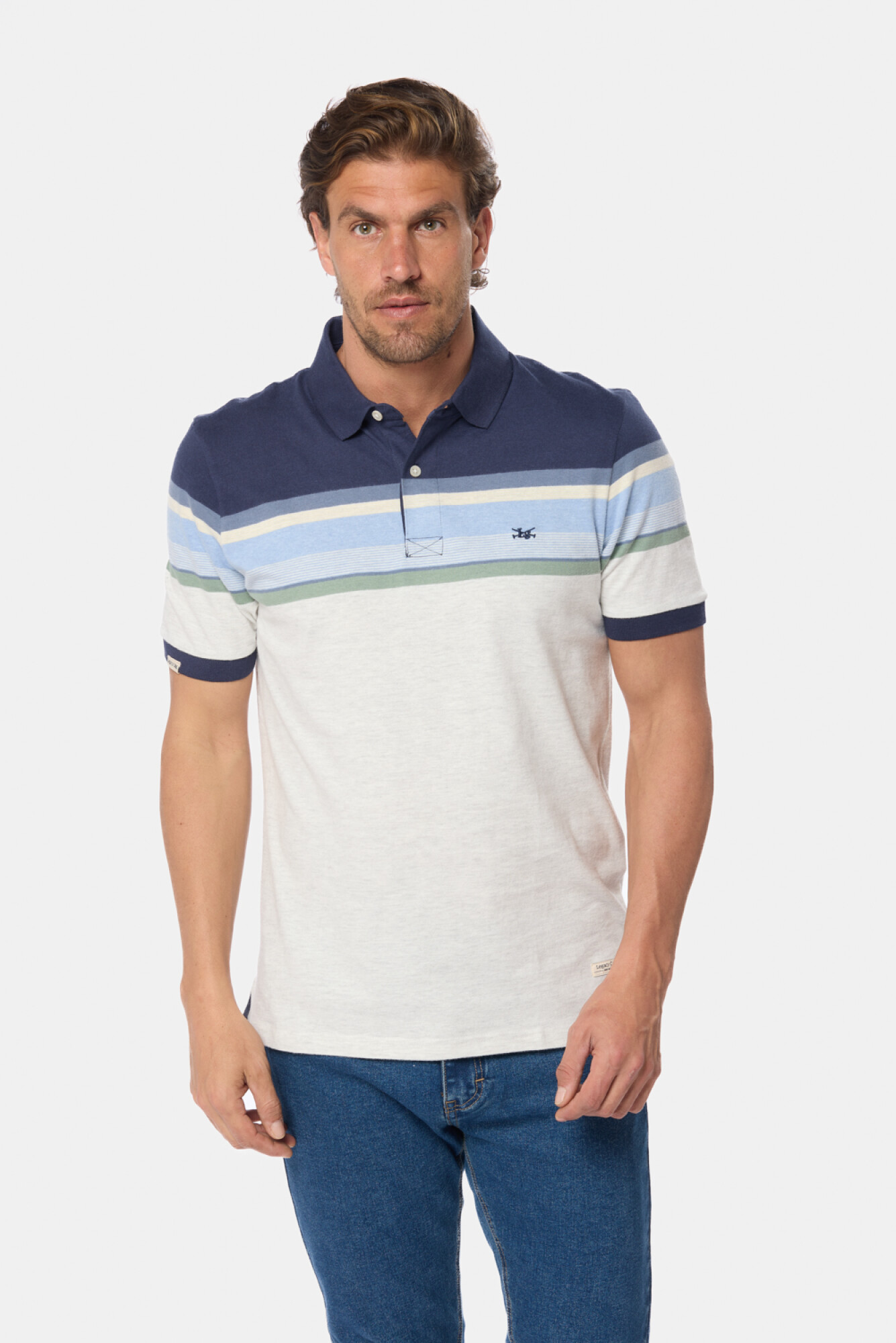 Remera polo rayada. Botones personalizados y logo en el pecho.