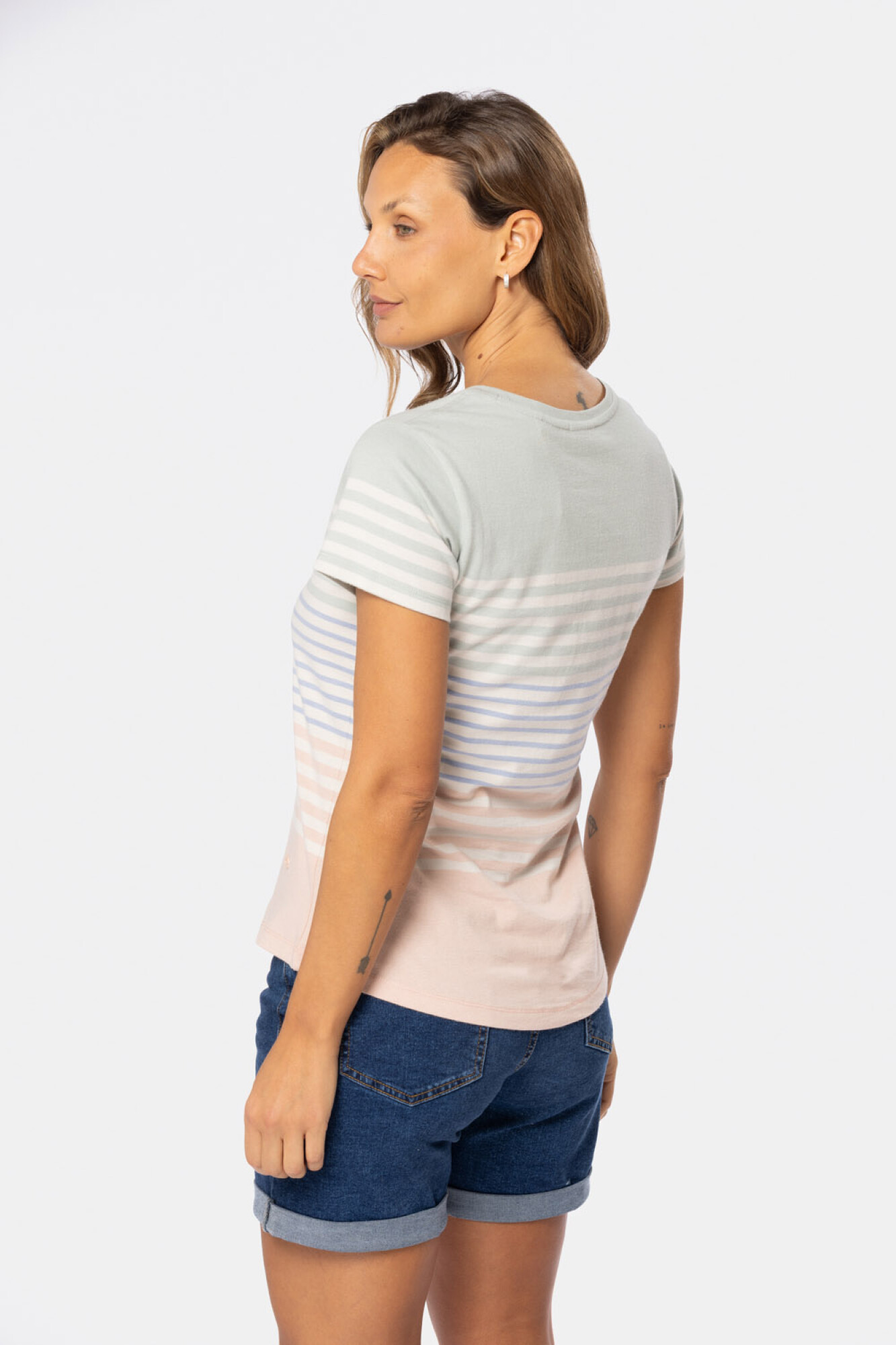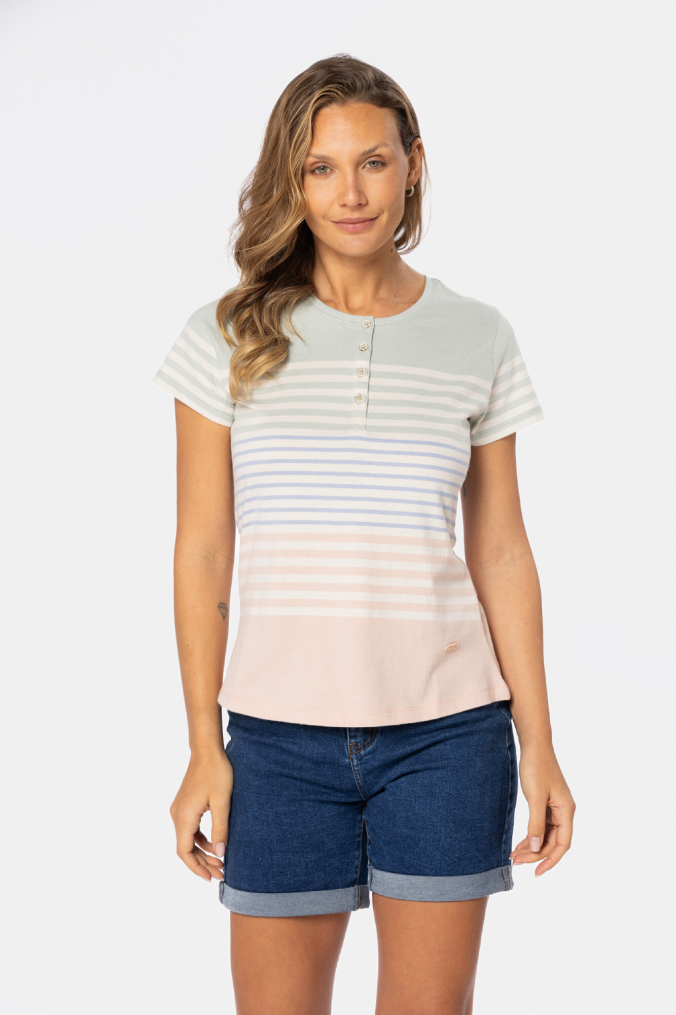 Remera rayada con botones personalizados, cuello redondo manga corta, textura suave
