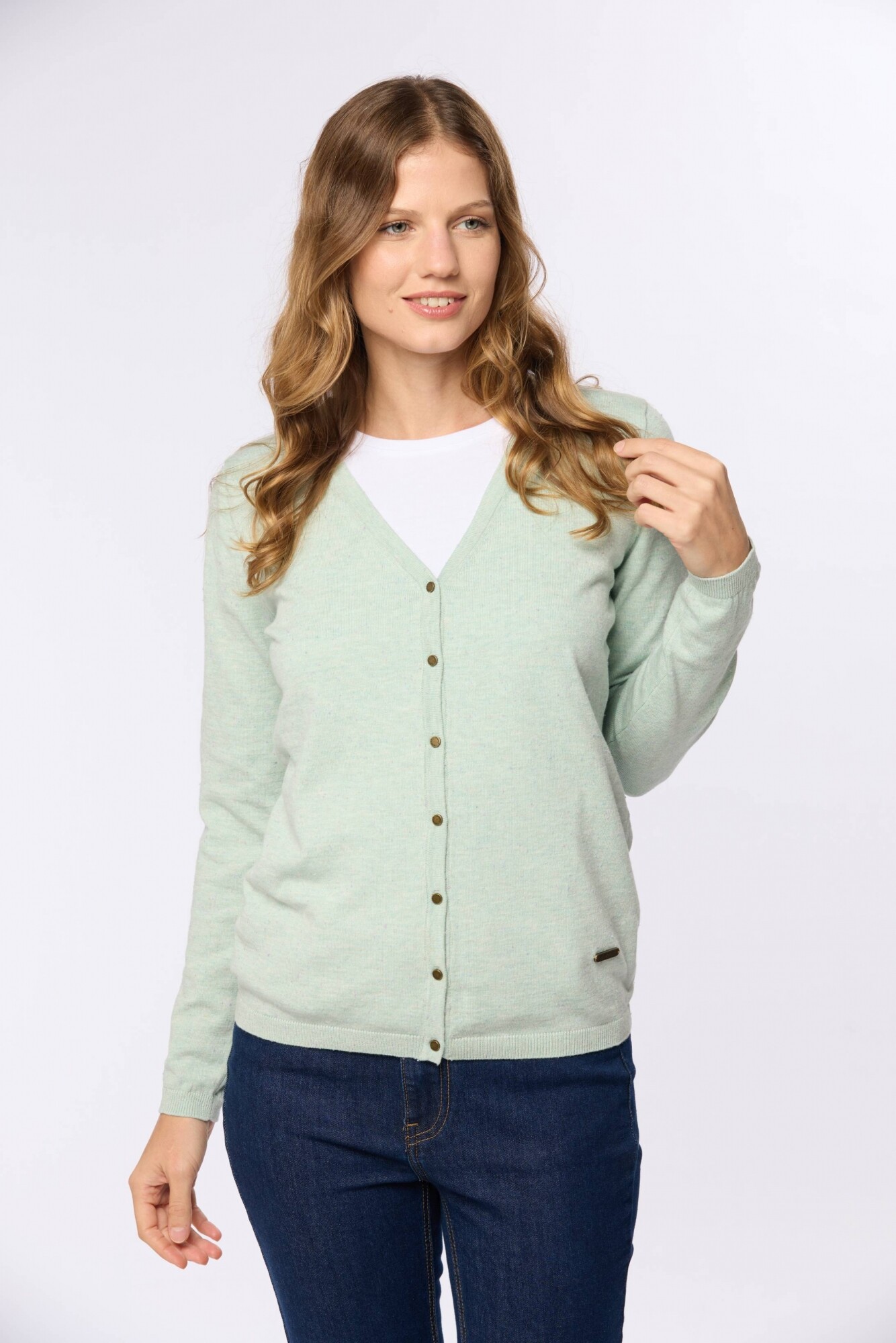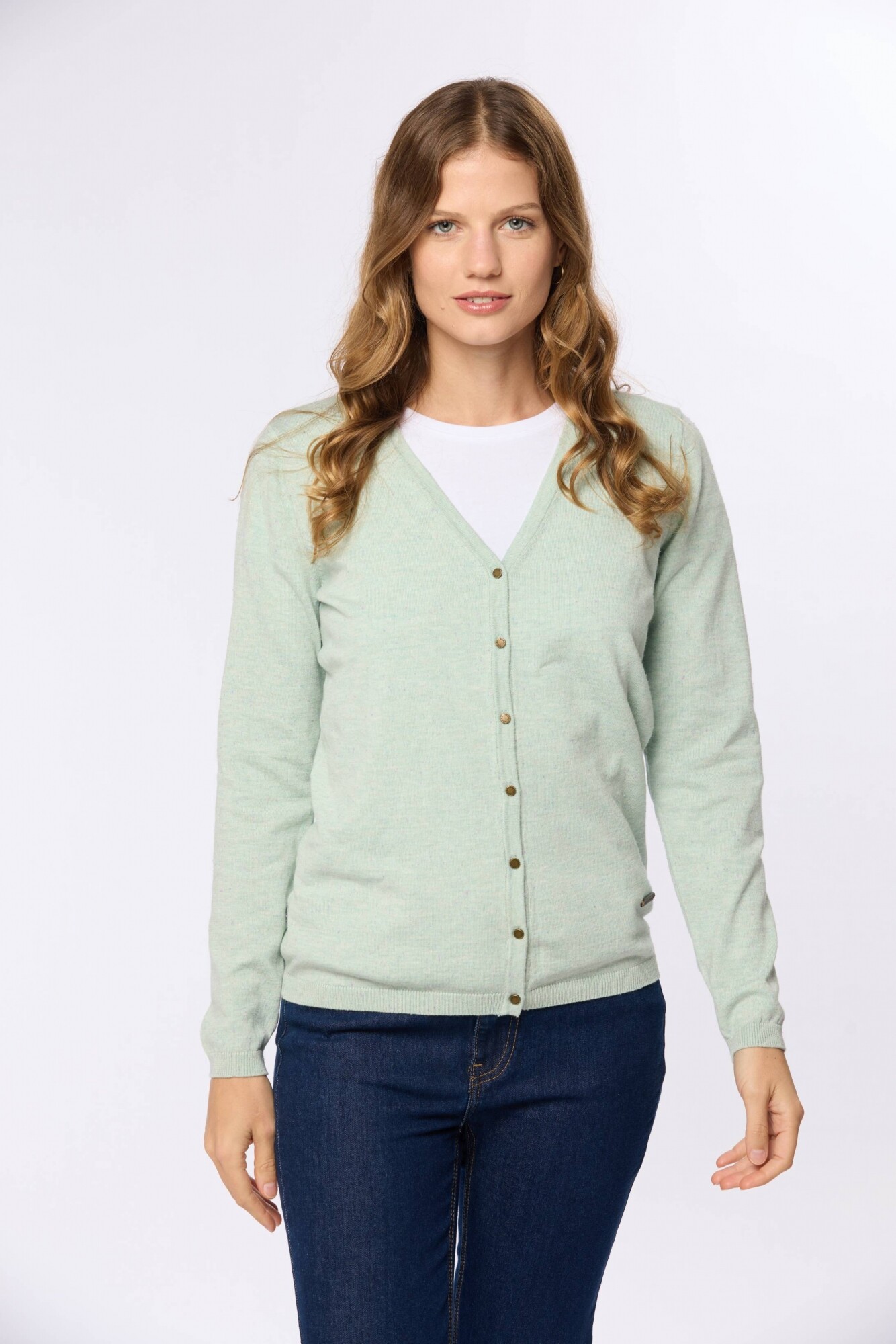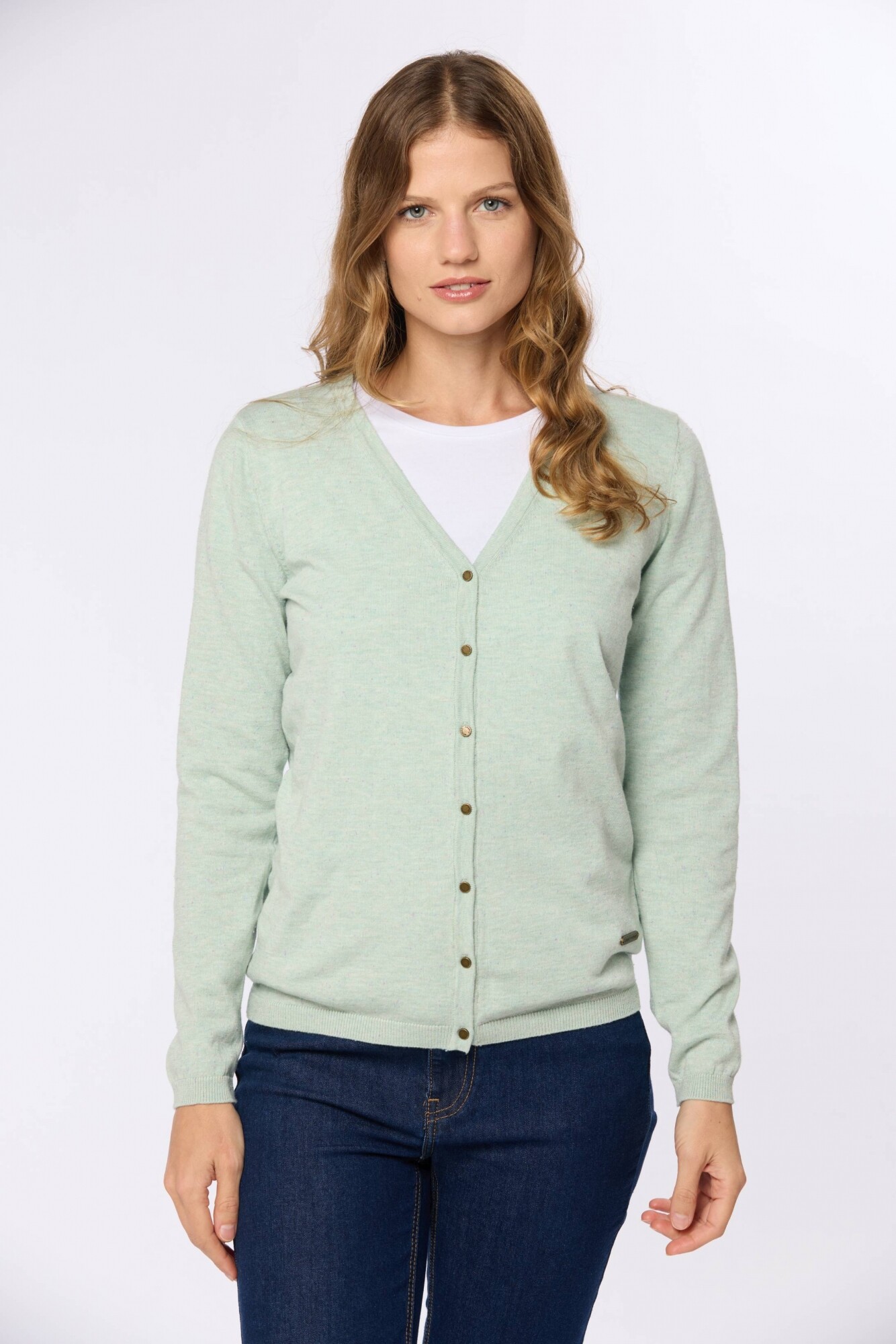 Saco tejido fino de hilo de algodón con botones. Puños en rib. Corte clásico La modelo mide 1,70 m y usa talle S.